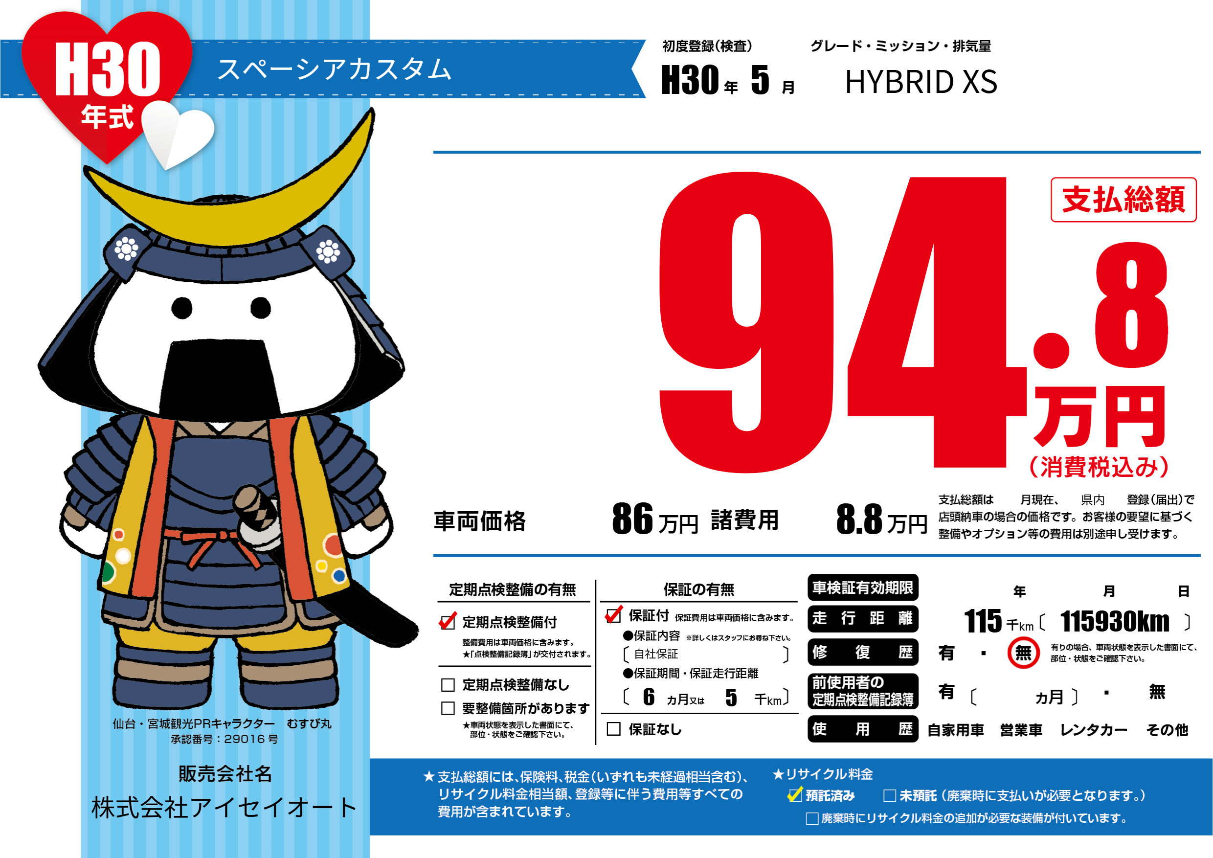 | 車名 | スペーシアカスタム | グレード ミッション 排気量 |