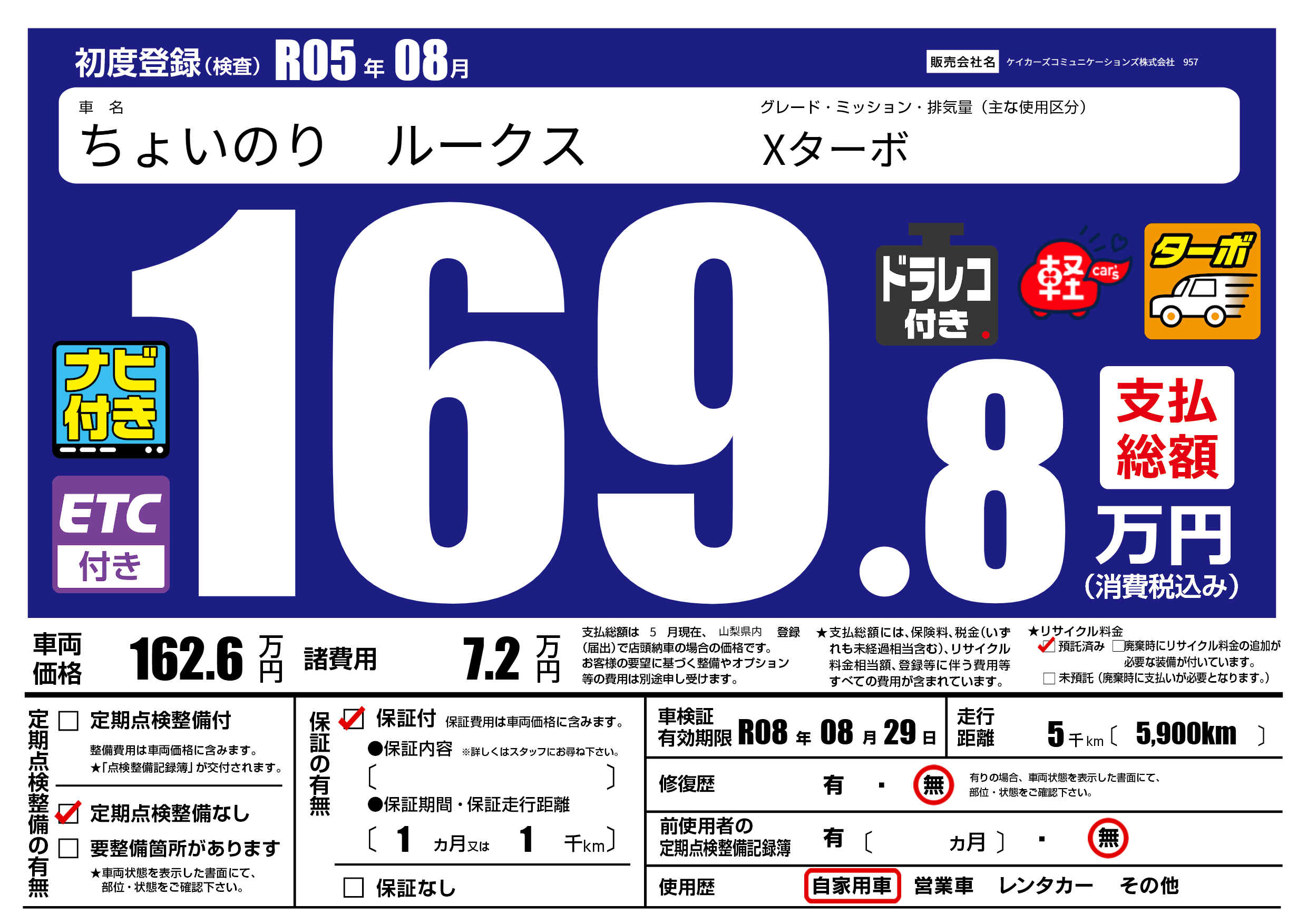 | 走行キロ | 0.5万km | 初年度登録 | R05年08月 |