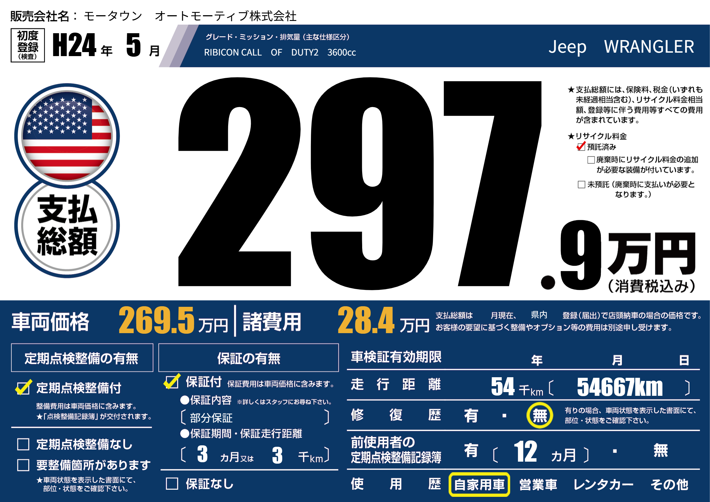 | 車名 | Jeep WRANGLER | グレード ミッション 排気量 |