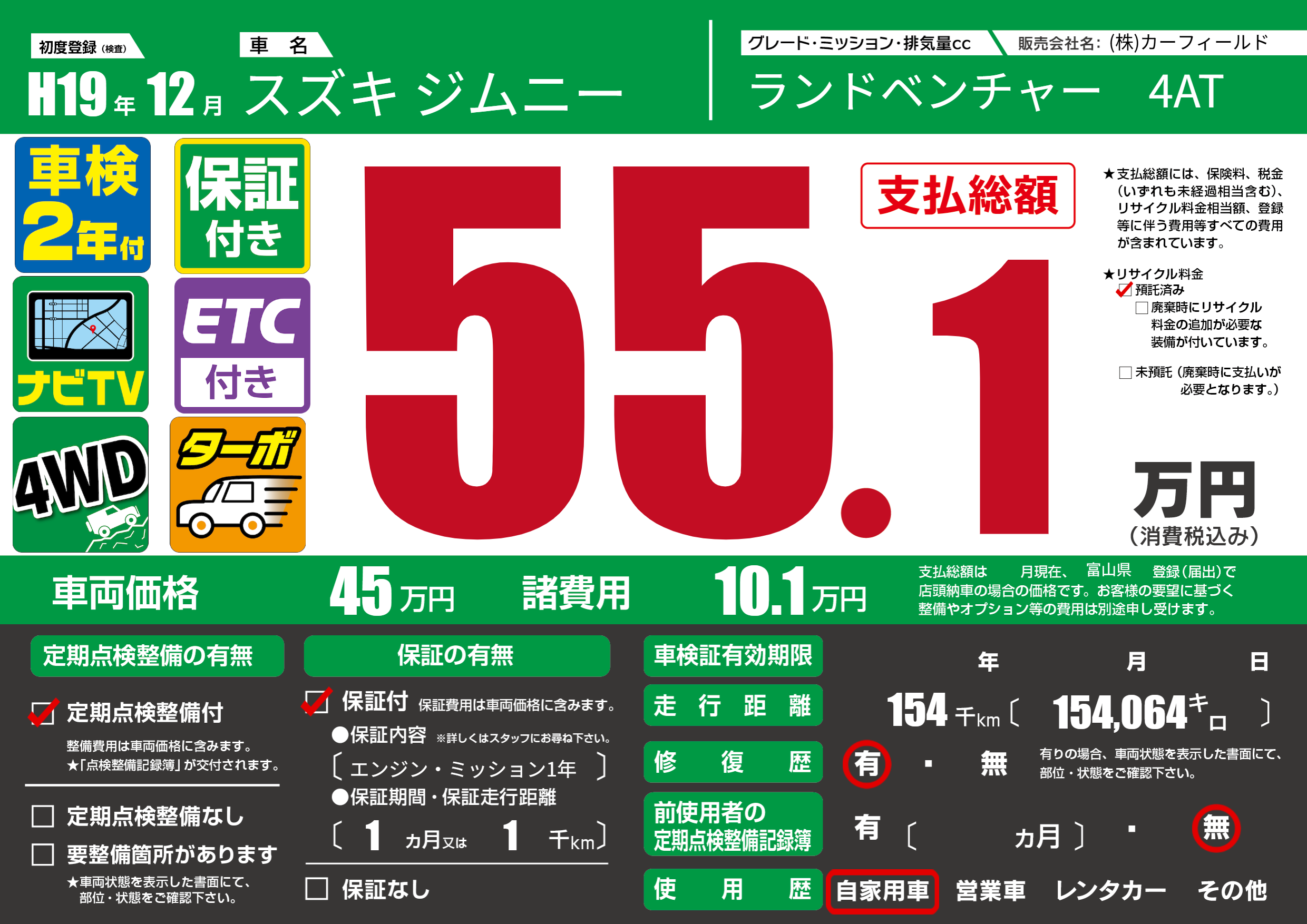 | 走行キロ | 15.4万km | 初年度登録 | H19年12月 |