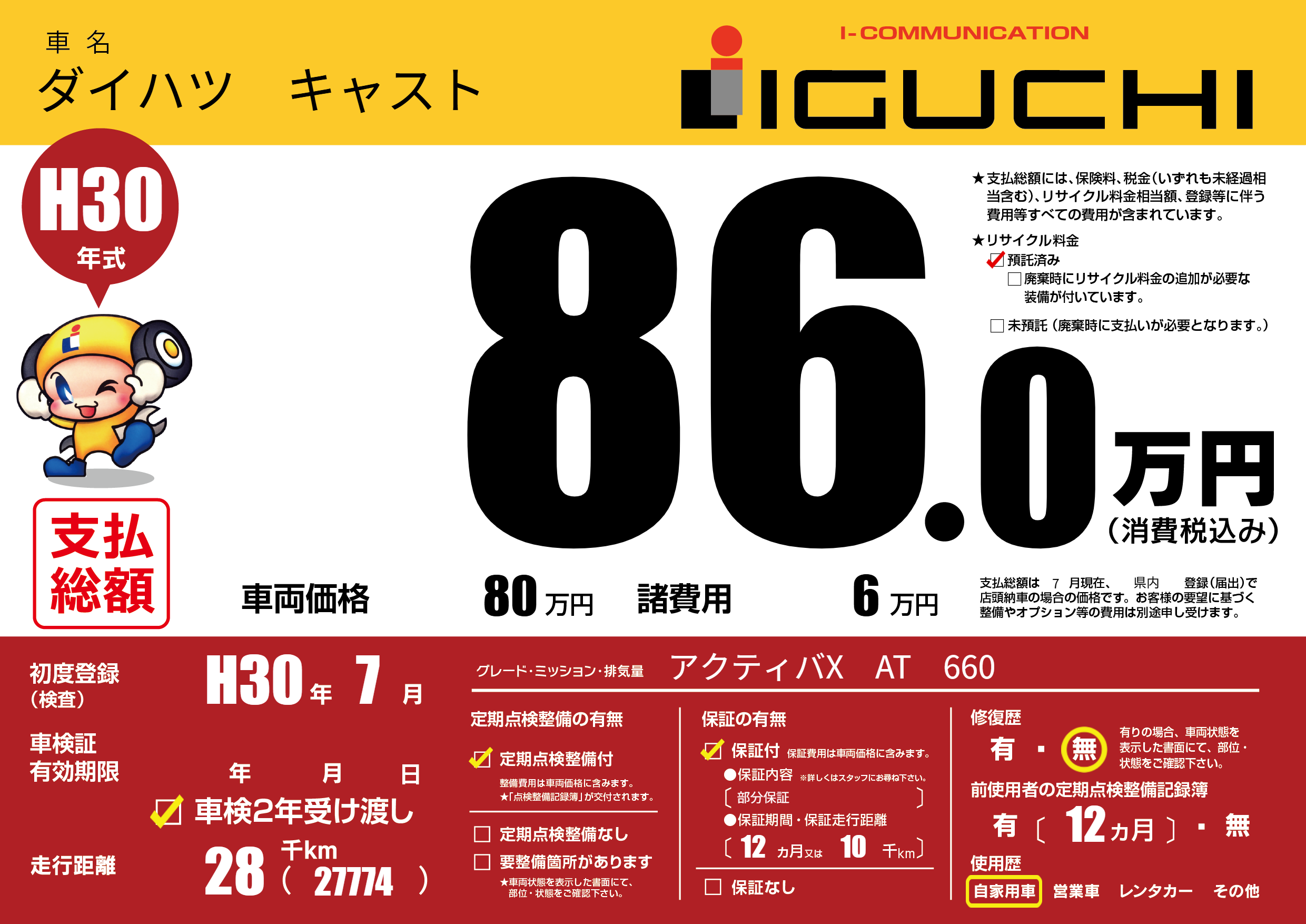 | 走行キロ | 2.8万km | 初年度登録 | H30年7月 |