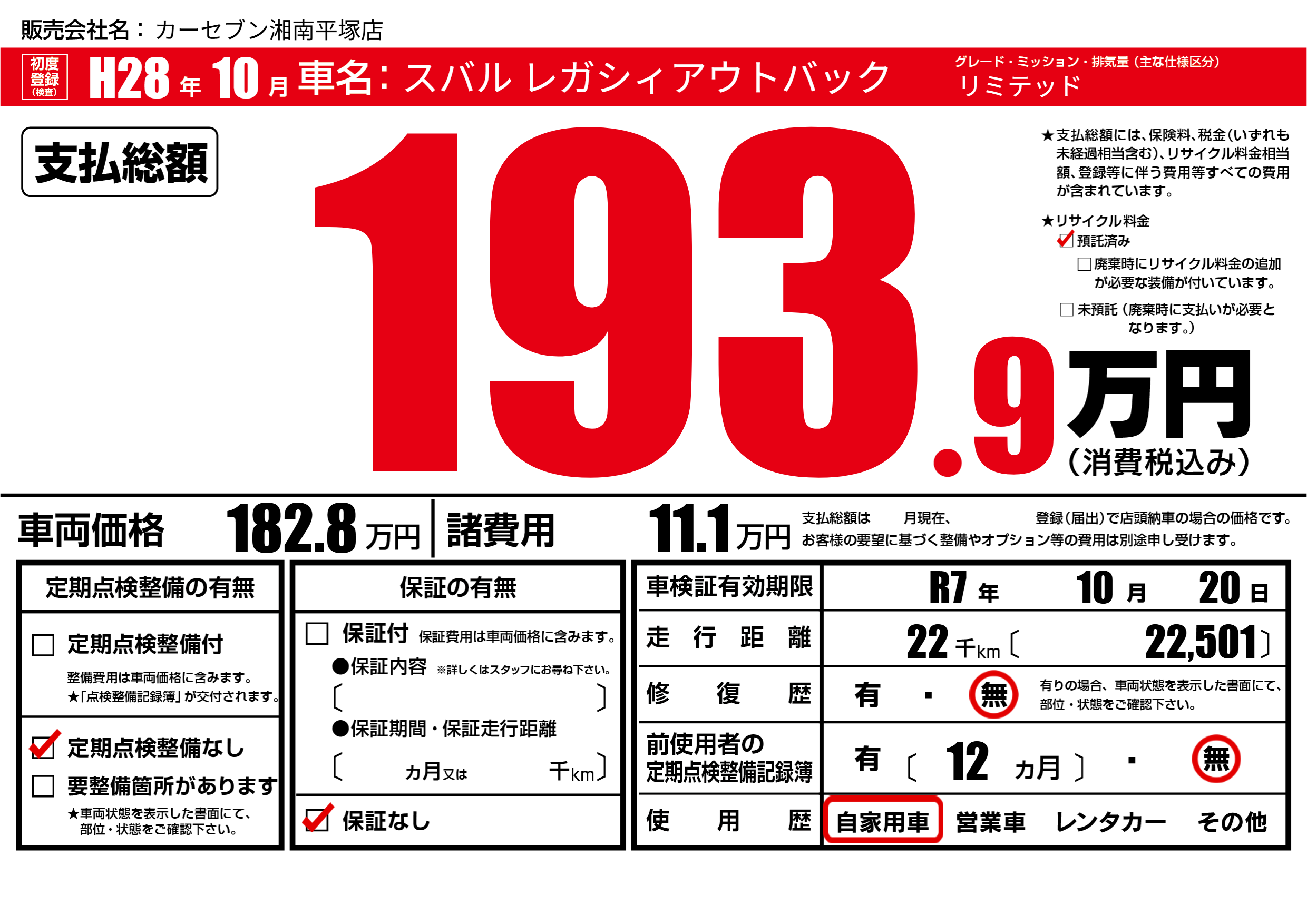 | 車名 | スバル レガシィアウトバック | グレード ミッション 排気量 |