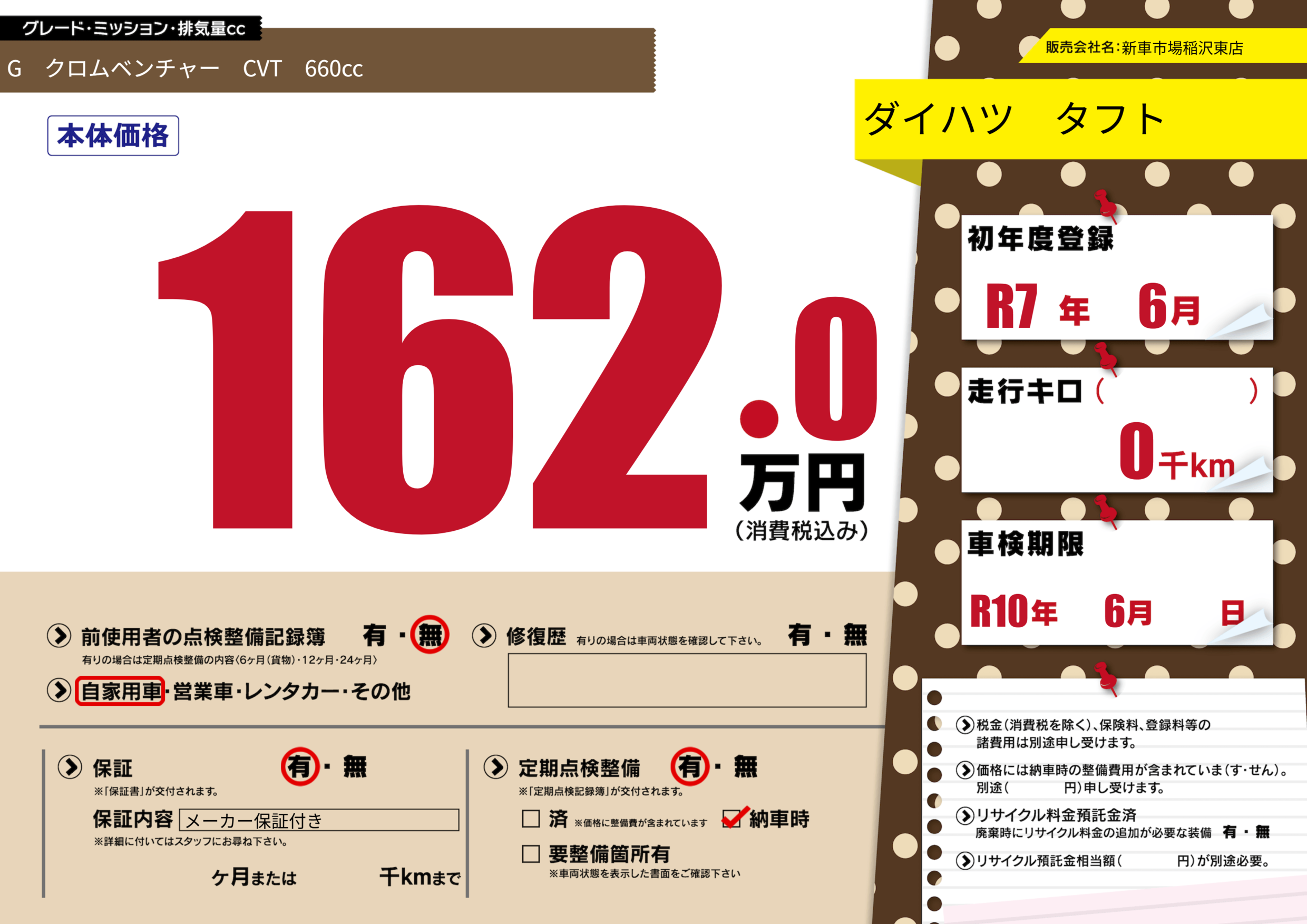 | 車名 | ダイハツ タフト | グレード ミッション 排気量 |