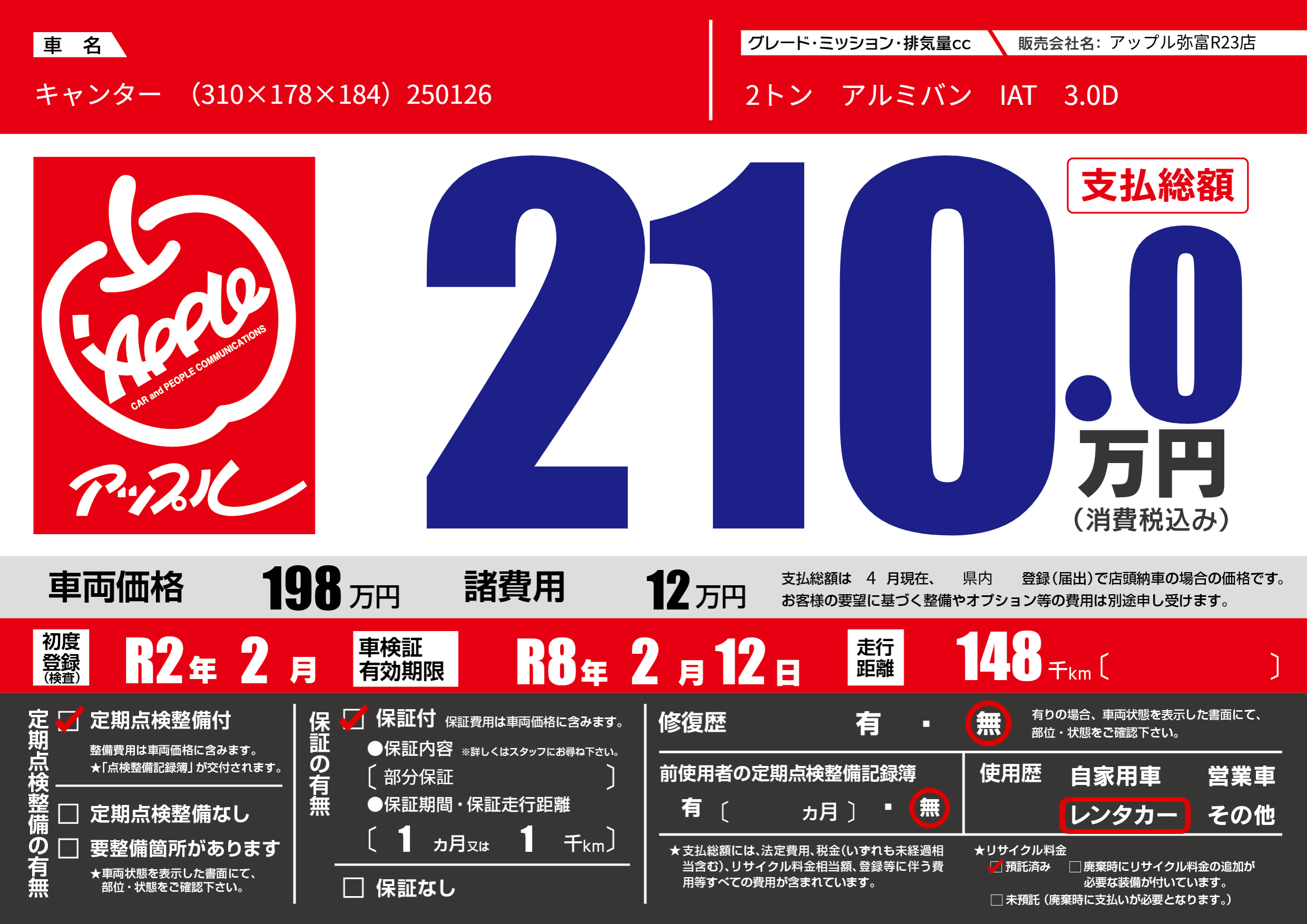 | 車名 | キャンター (310×178×184)250126 | グレード ミッション 排気量 |