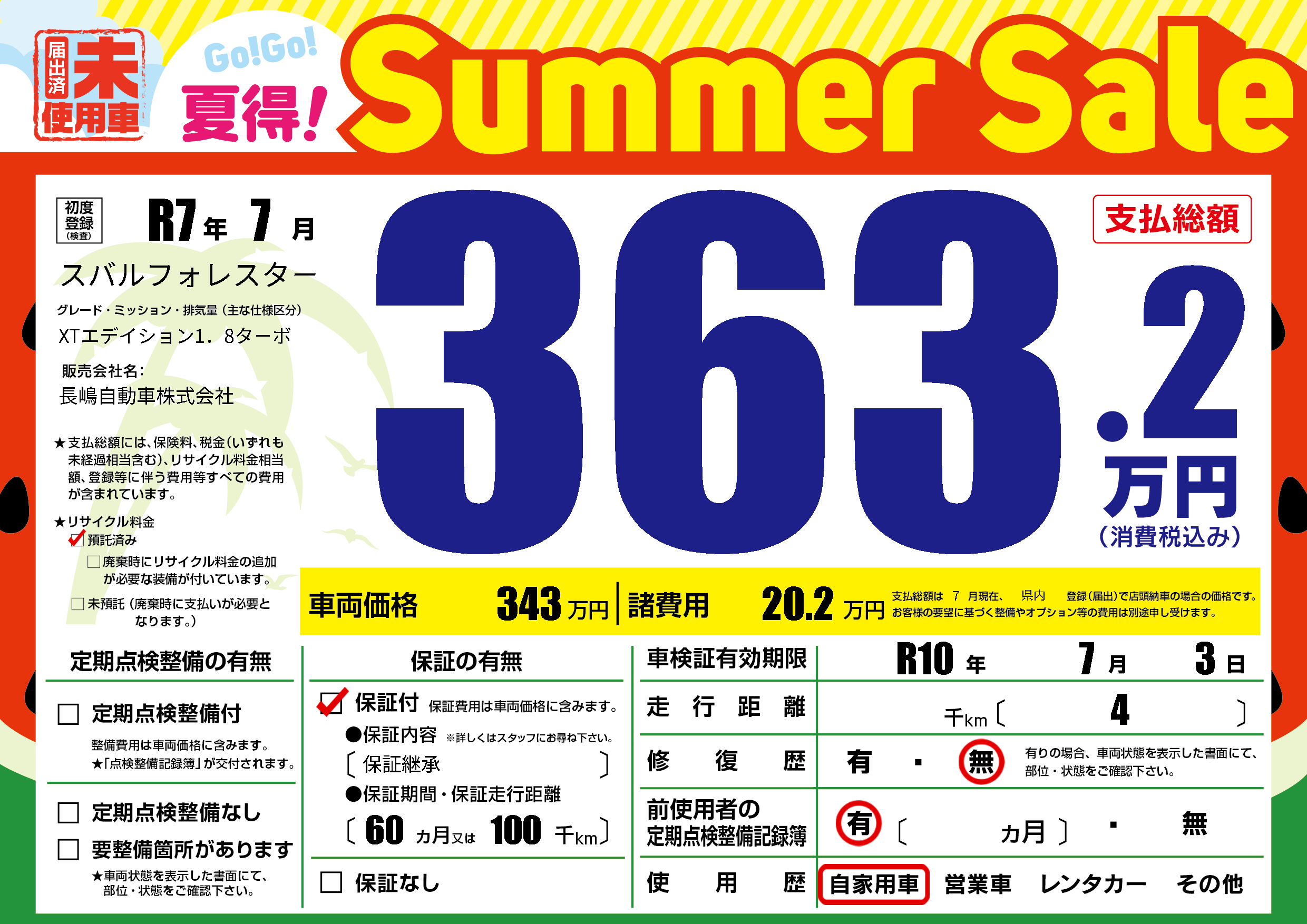 | 走行キロ | - | 初年度登録 | R7年7月 |
