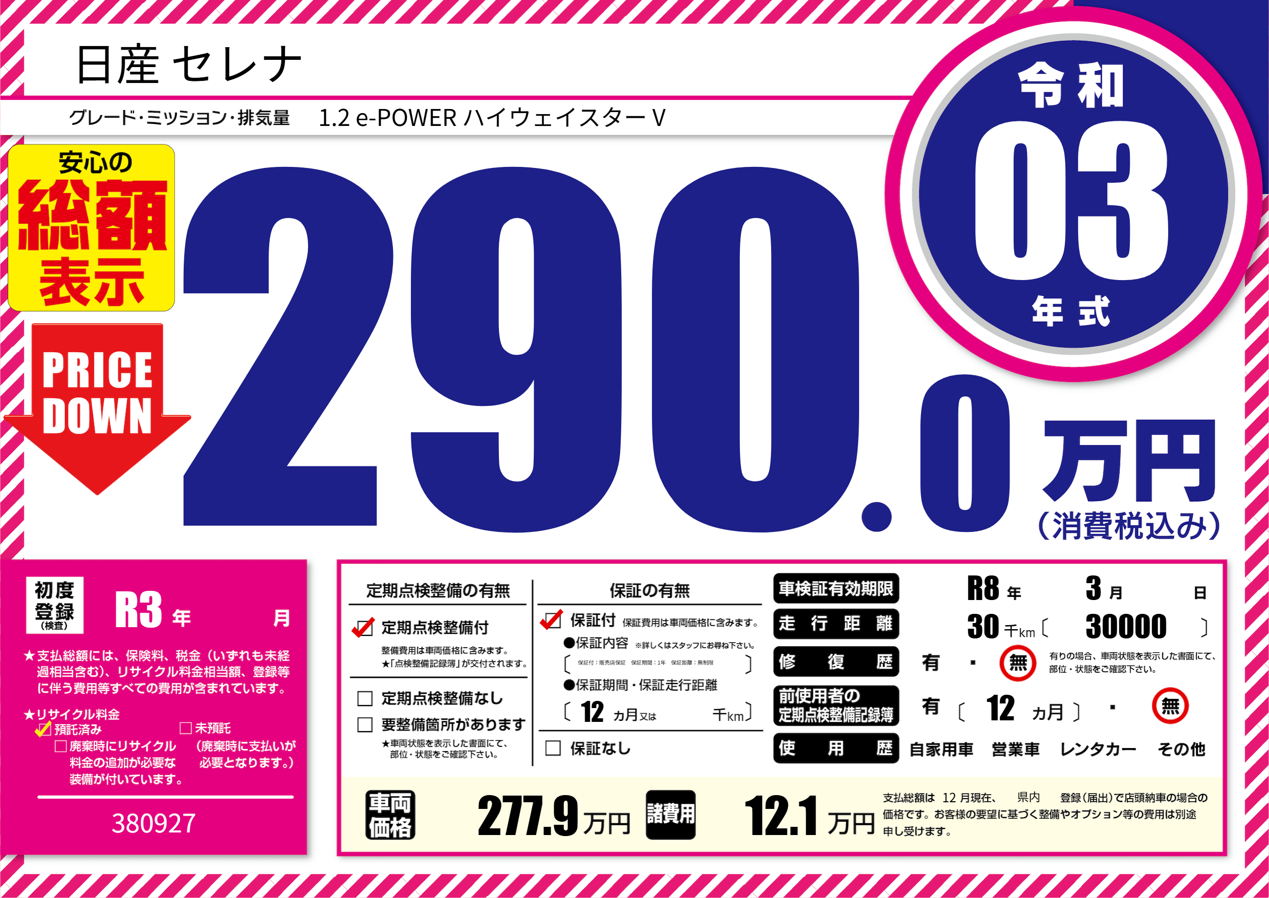 | 車名 | 日産 セレナ | グレード ミッション 排気量 |