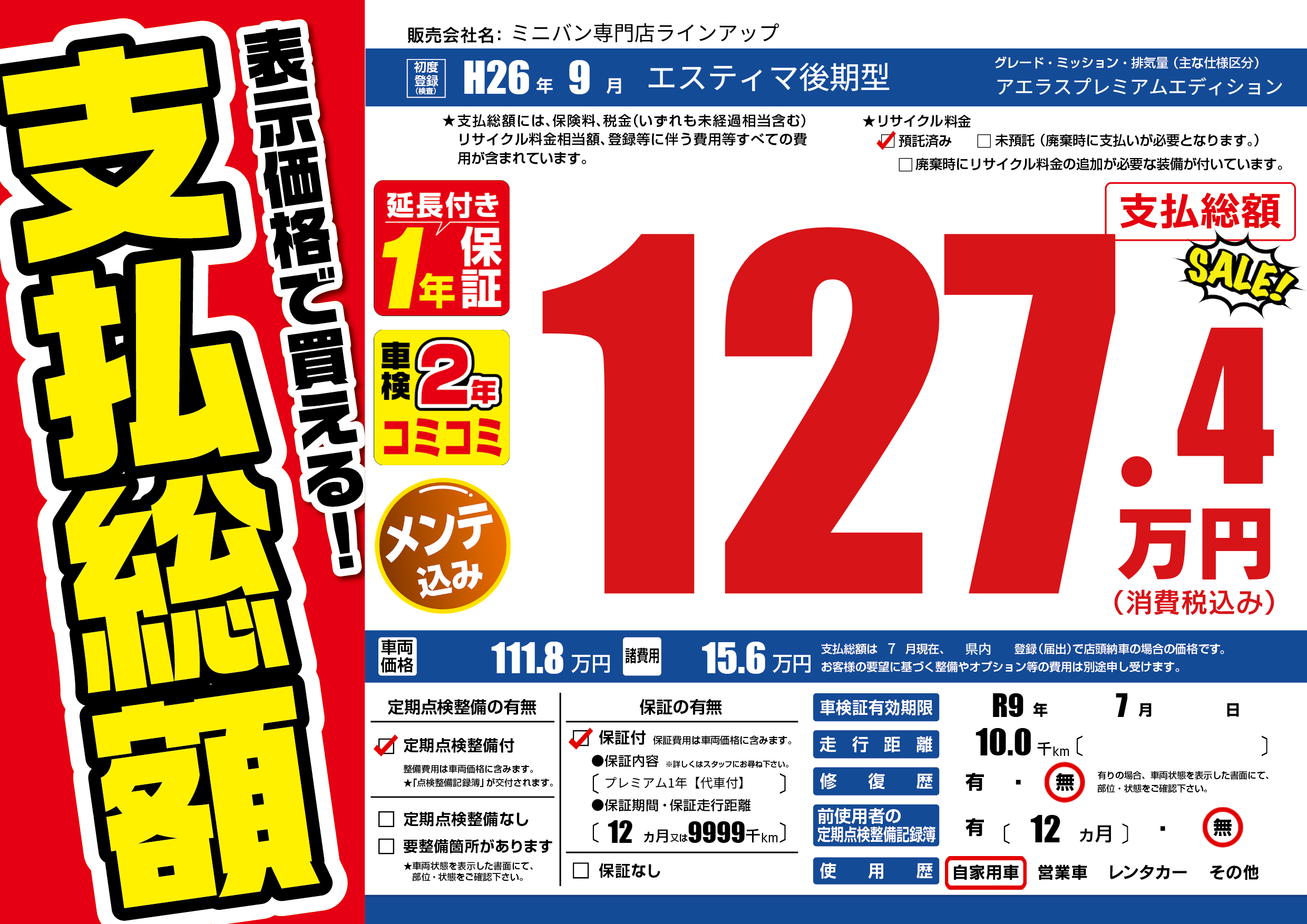 | 走行キロ | 1万km | 初年度登録 | H26年9月 |