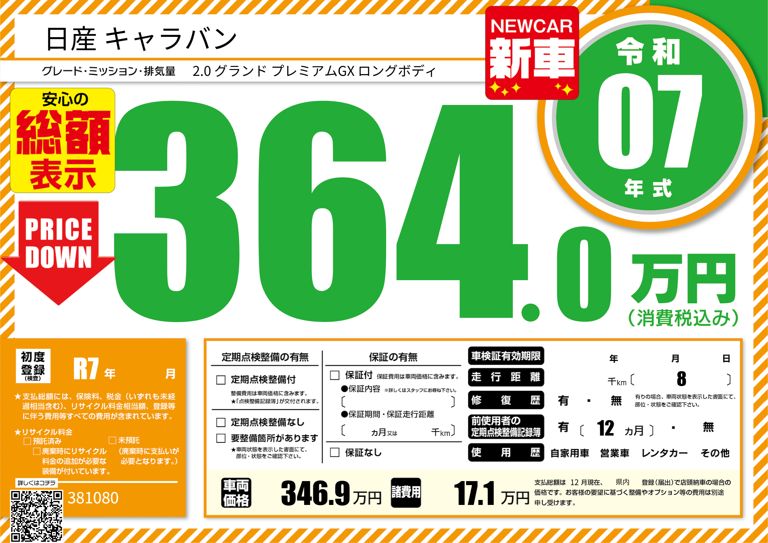 | 走行キロ | - | 初年度登録 | R7年---月 |