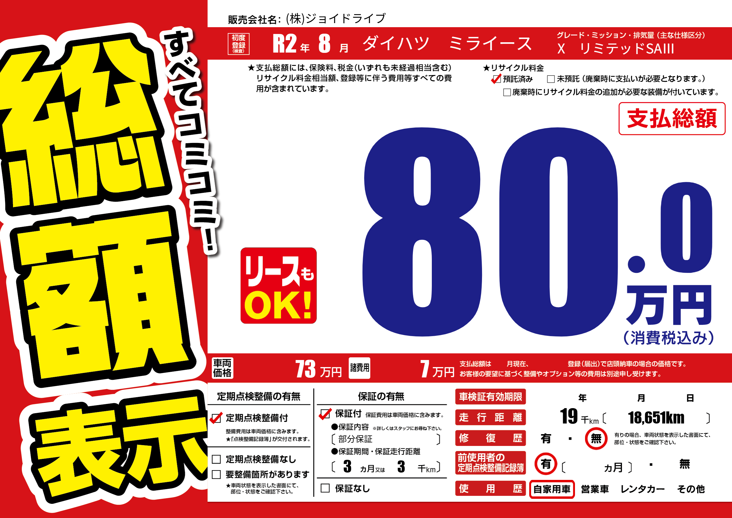 保証付き 保証内容(部分保証) 3ヶ月または(3)千kmまで |
