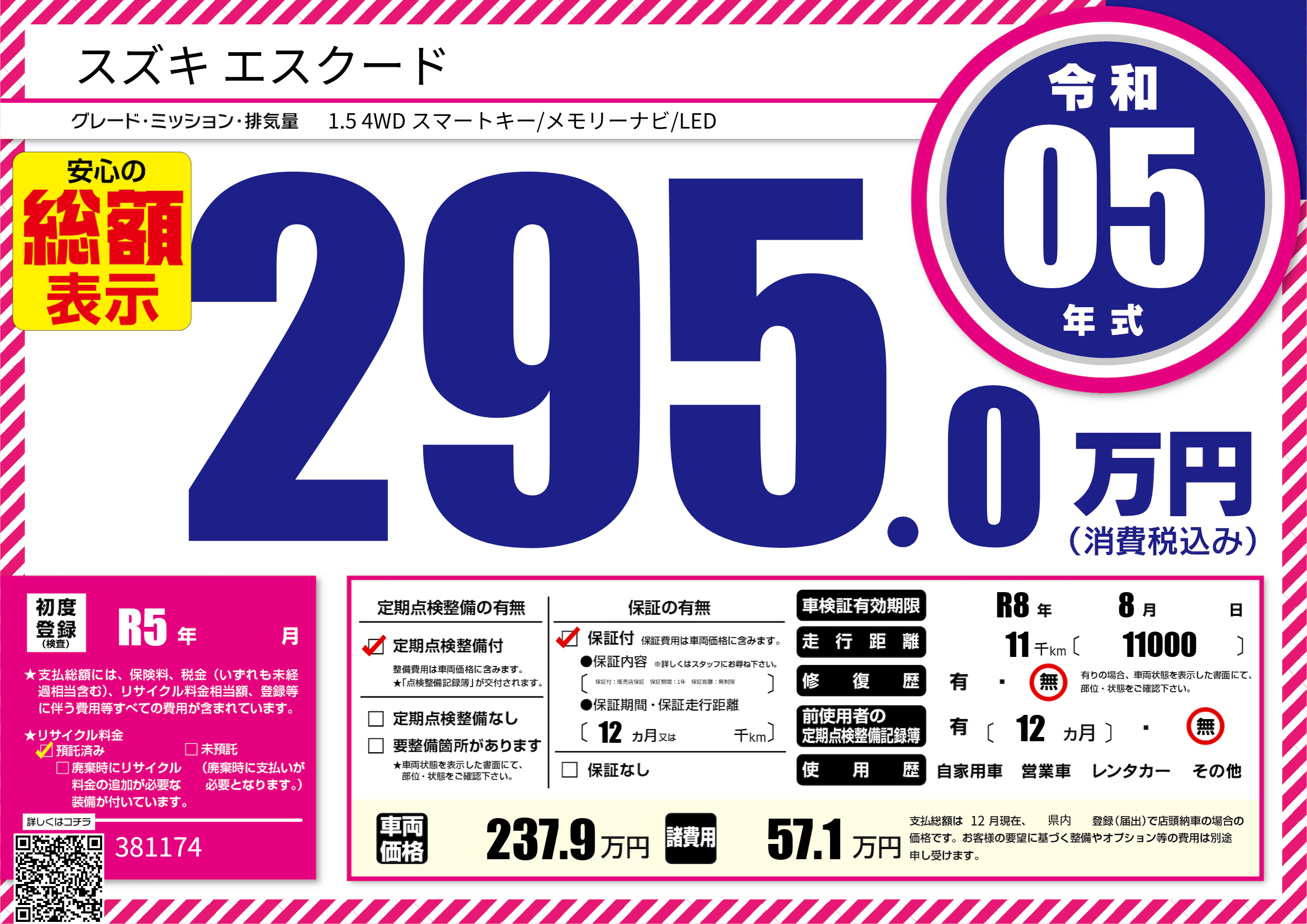 | 走行キロ | 1.1万km | 初年度登録 | R5年---月 |