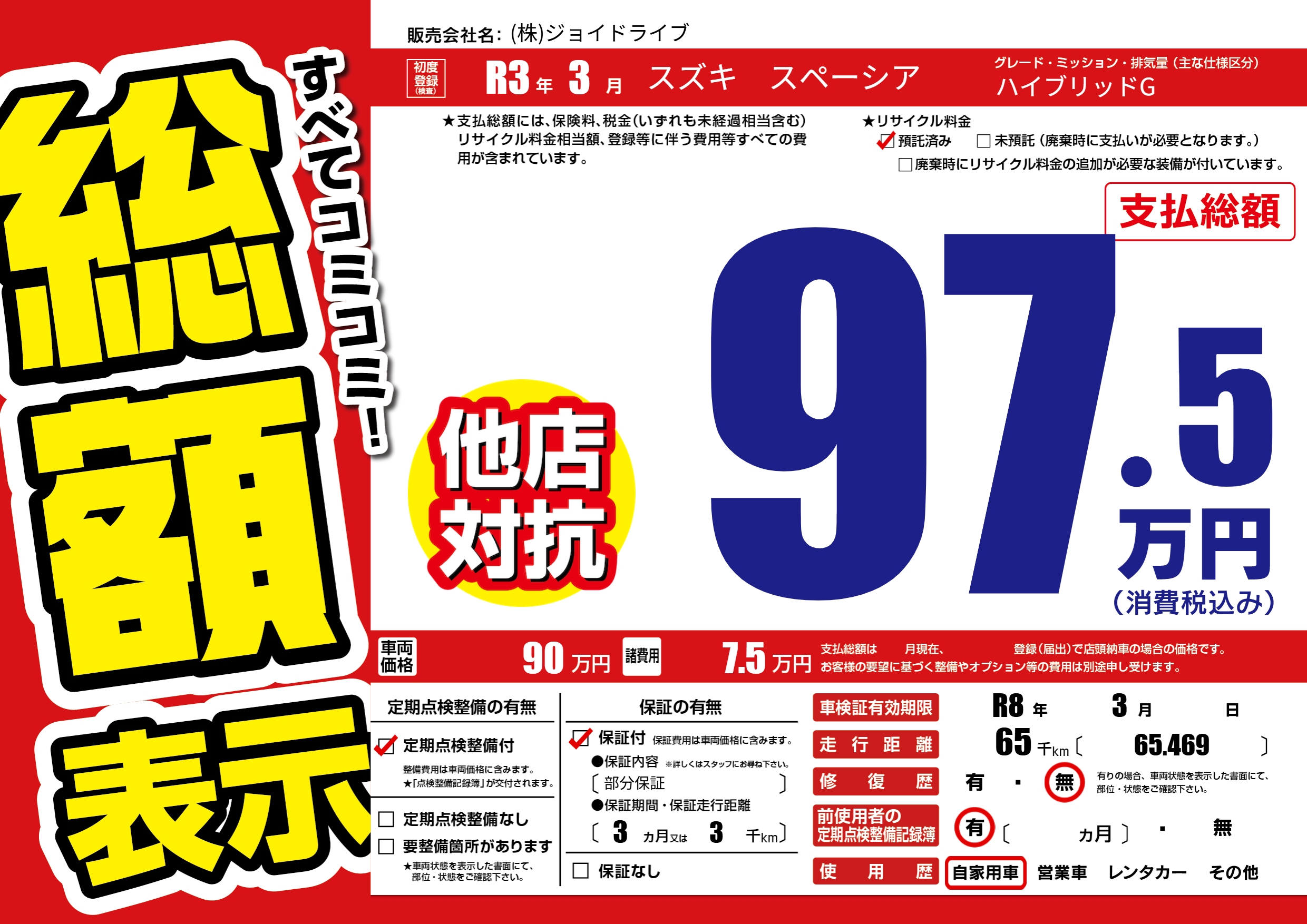 | 車名 | スズキ スペーシア | グレード ミッション 排気量 |