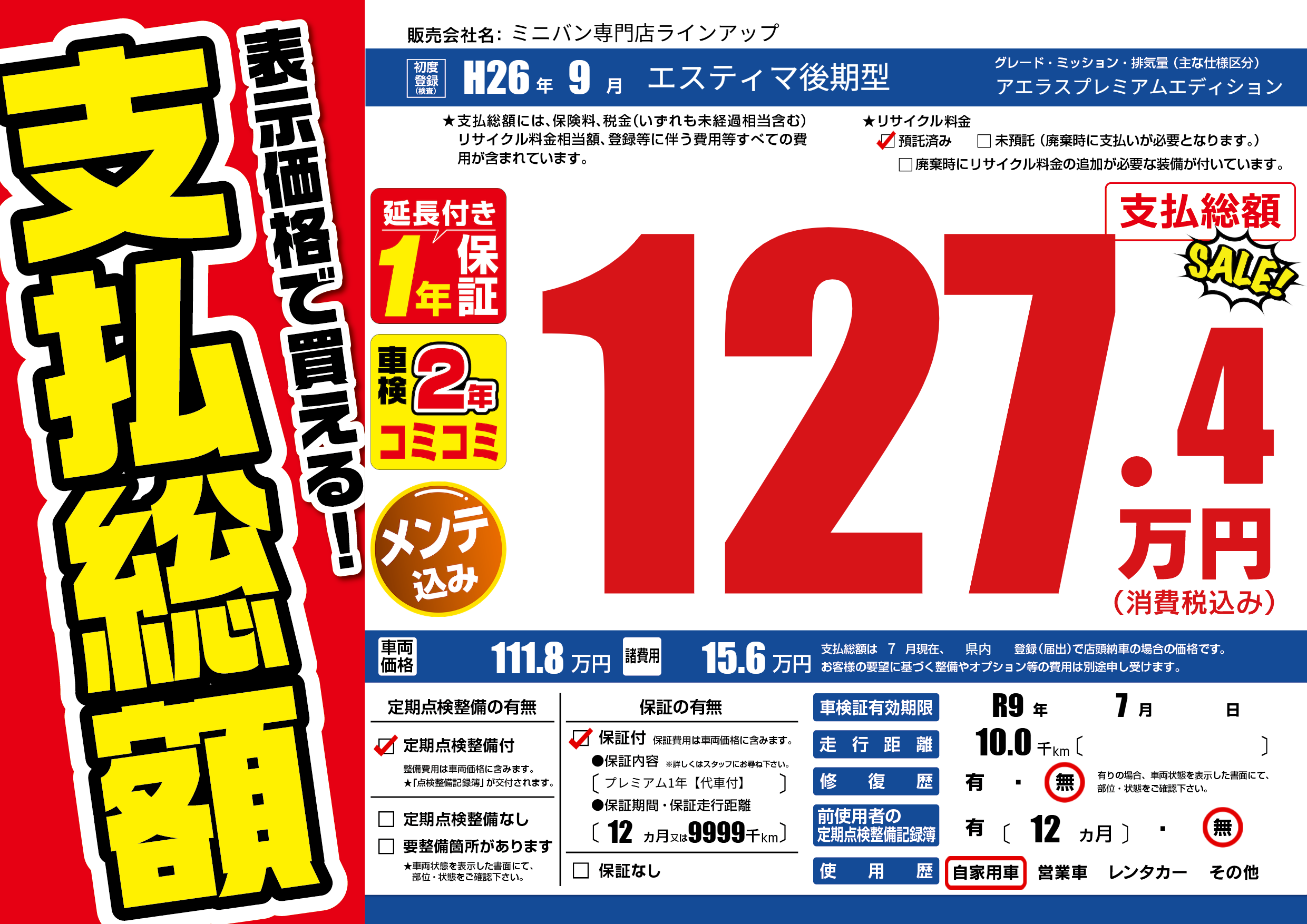 | 車名 | エスティマ後期型 | グレード ミッション 排気量 |