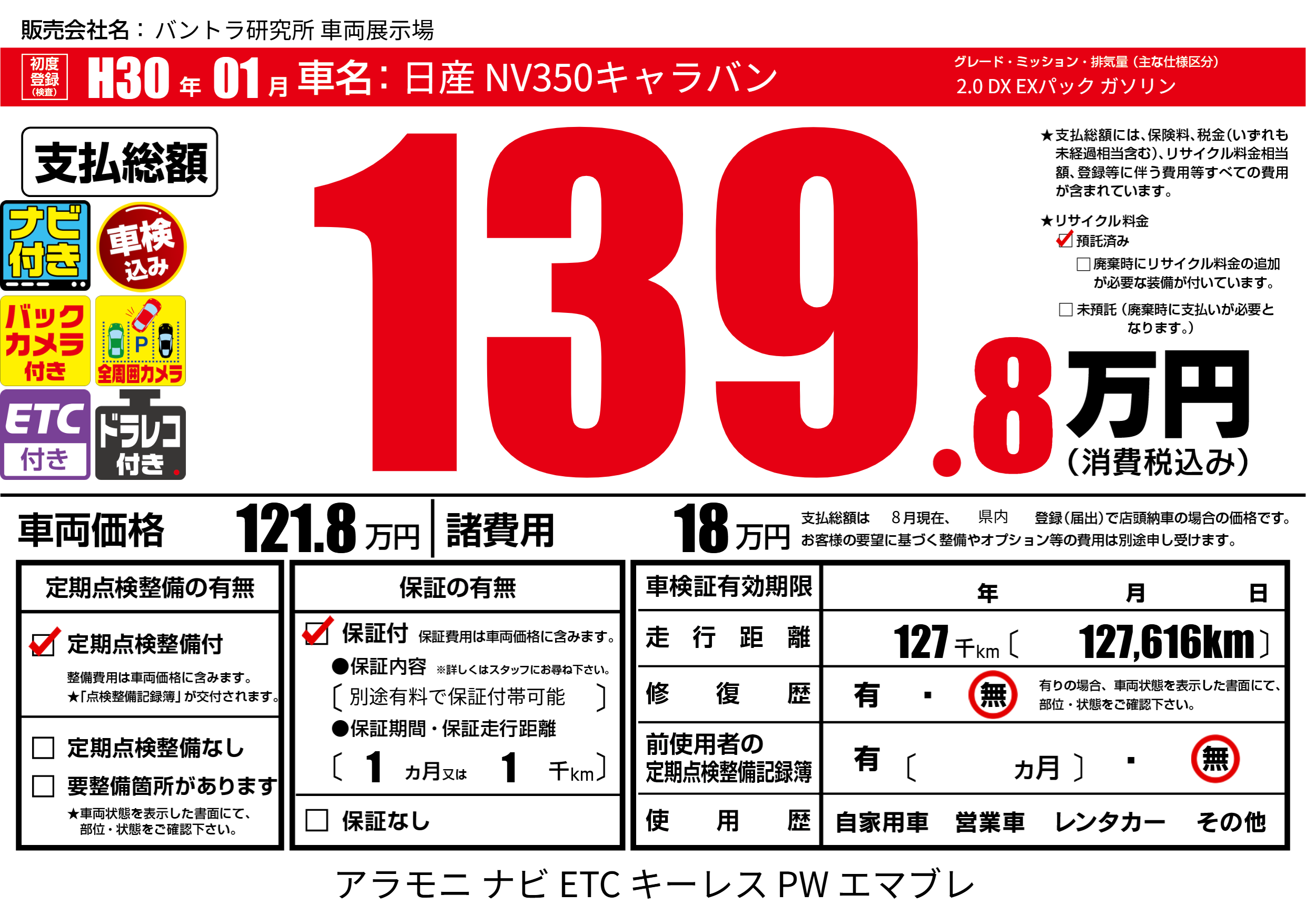 | 車名 | 日産 NV350キャラバン | グレード ミッション 排気量 |