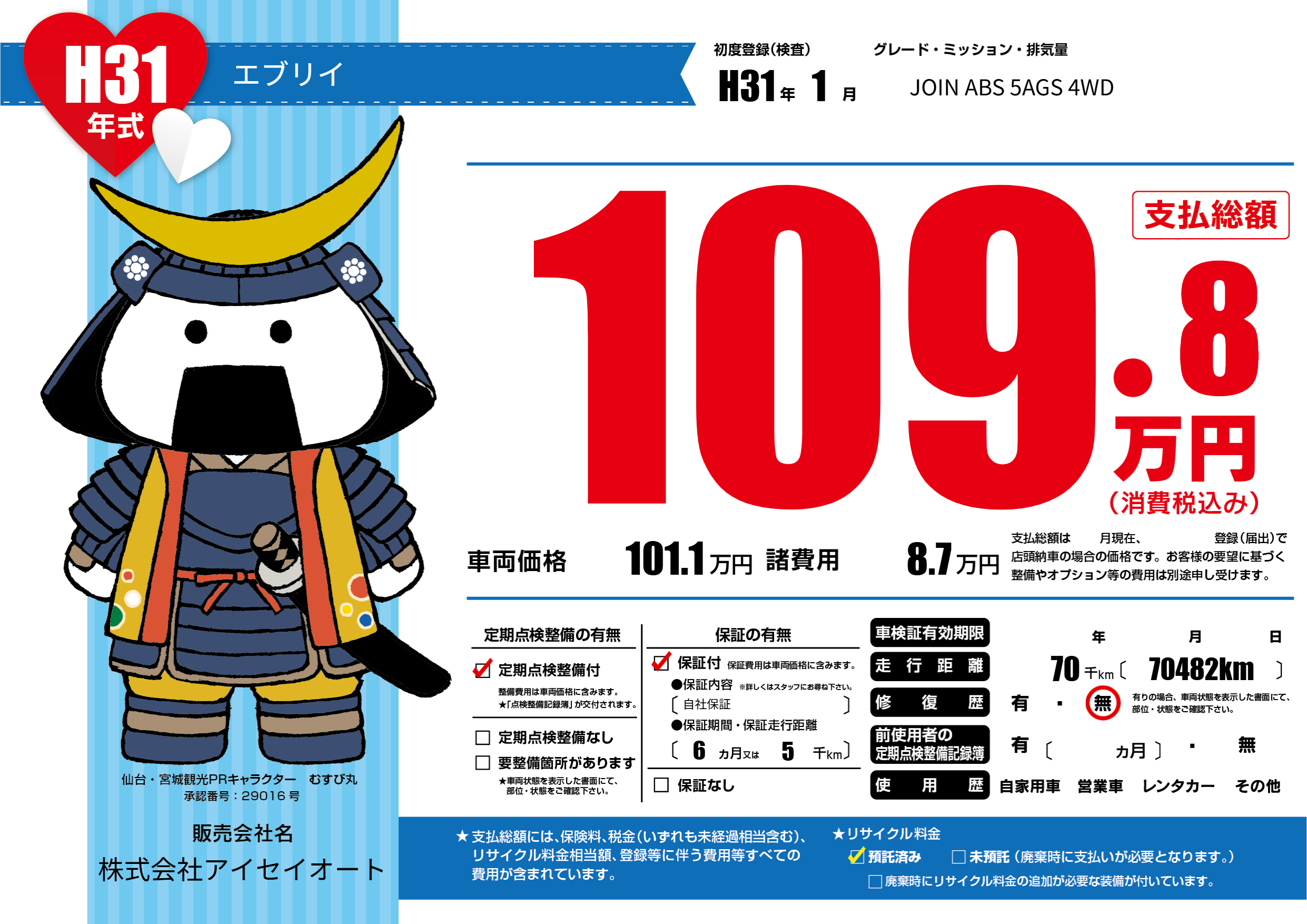 保証付き 保証内容(自社保証) 6ヶ月または(5)千kmまで |