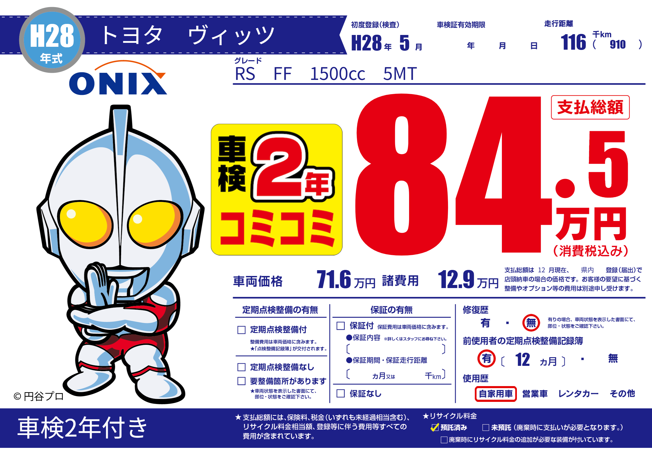 | 走行キロ | 11.6万km | 初年度登録 | H28年5月 |