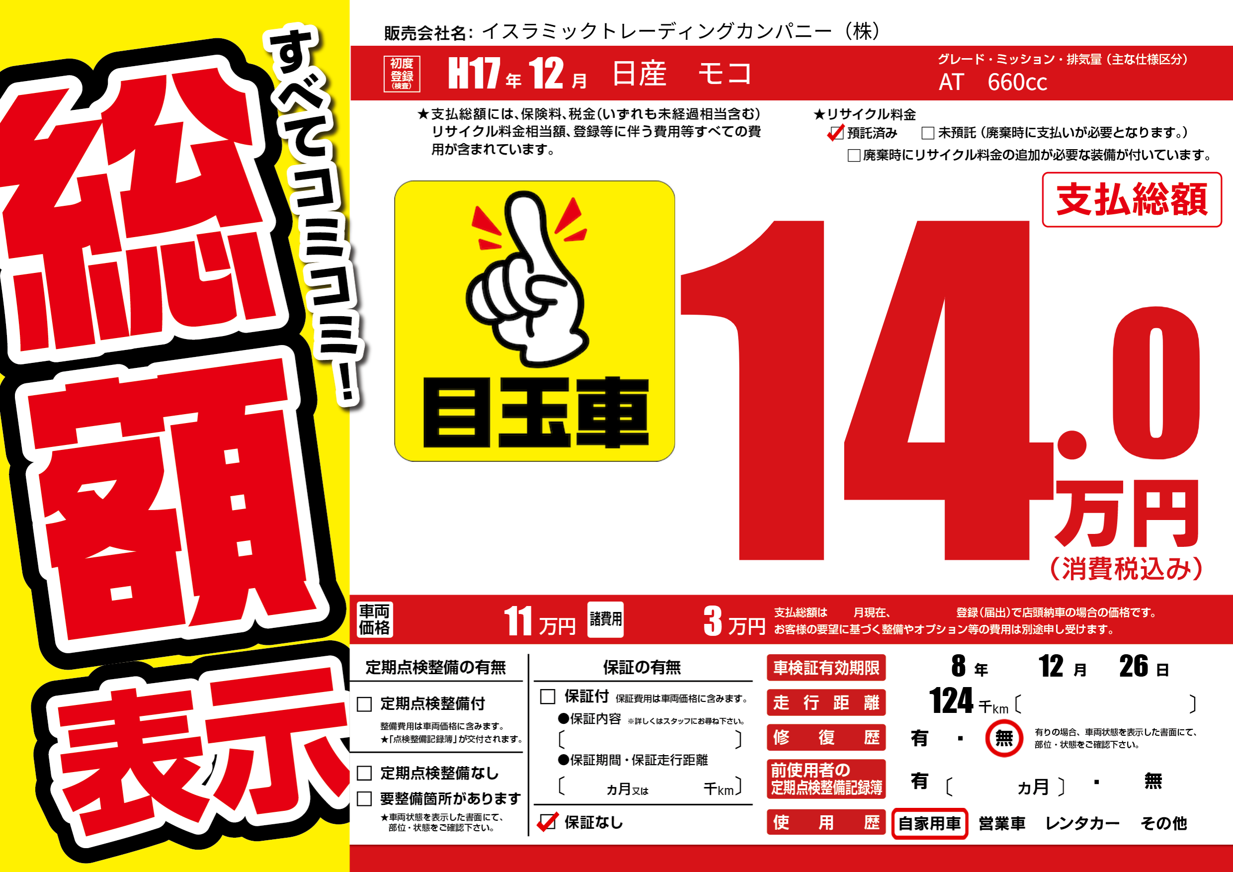 | 走行キロ | 12.4万km | 初年度登録 | H17年12月 |