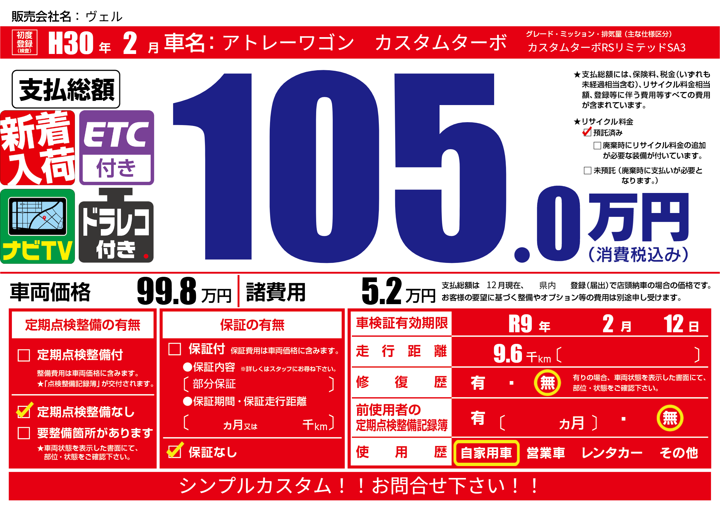 | 走行キロ | 0.9万km | 初年度登録 | H30年2月 |