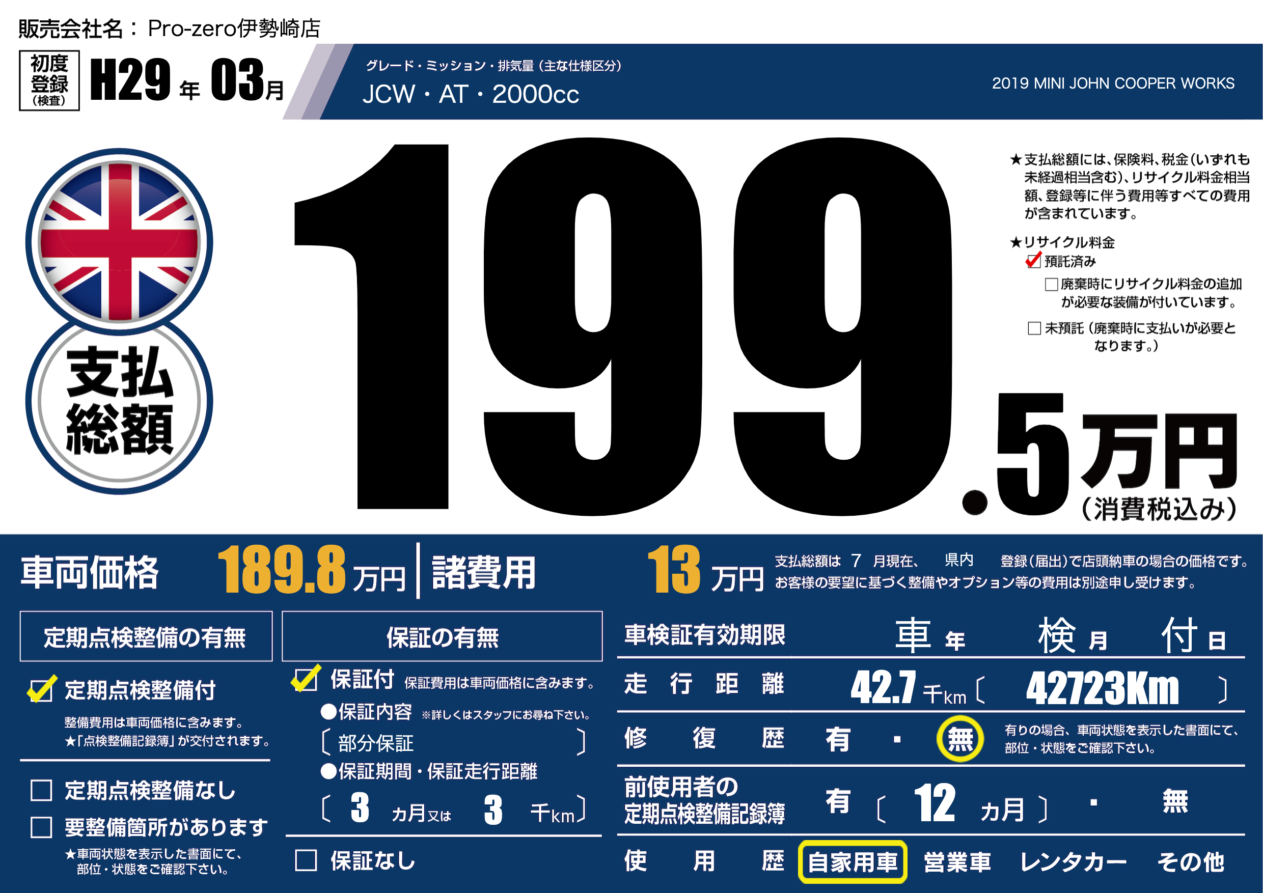 | 車名 | 2019 MINI JOHN COOPER WORKS | グレード ミッション 排気量 |