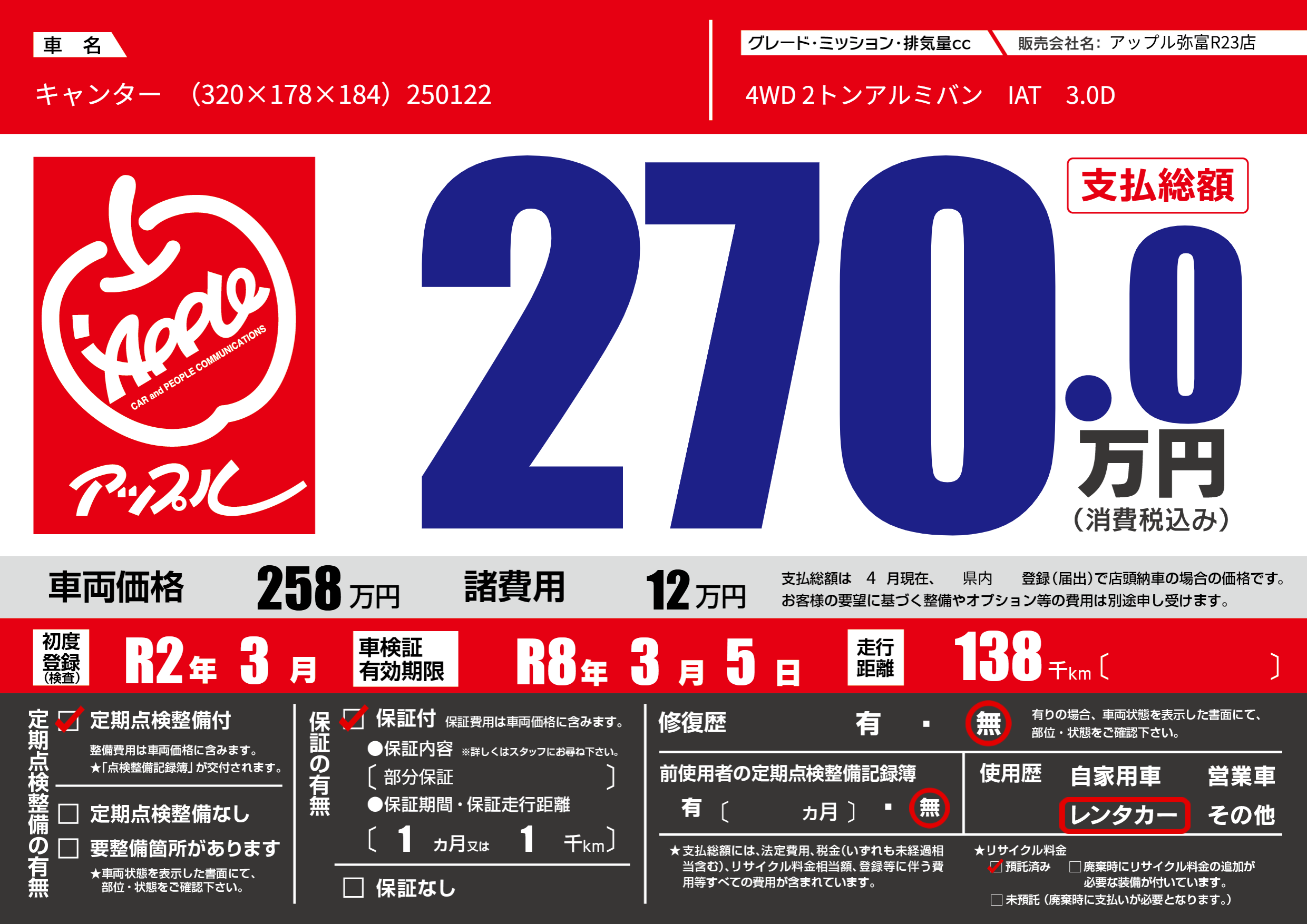 | 車名 | キャンター (320×178×184)250122 | グレード ミッション 排気量 |