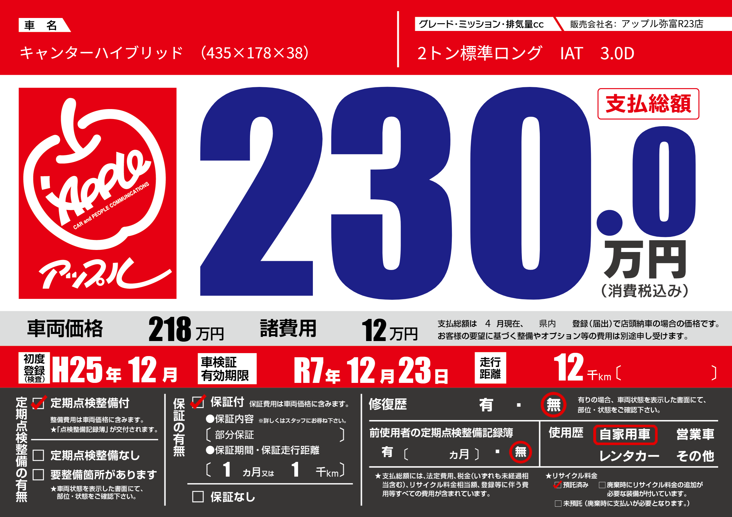 | 車名 | キャンターハイブリッド (435×178×38) | グレード ミッション 排気量 |