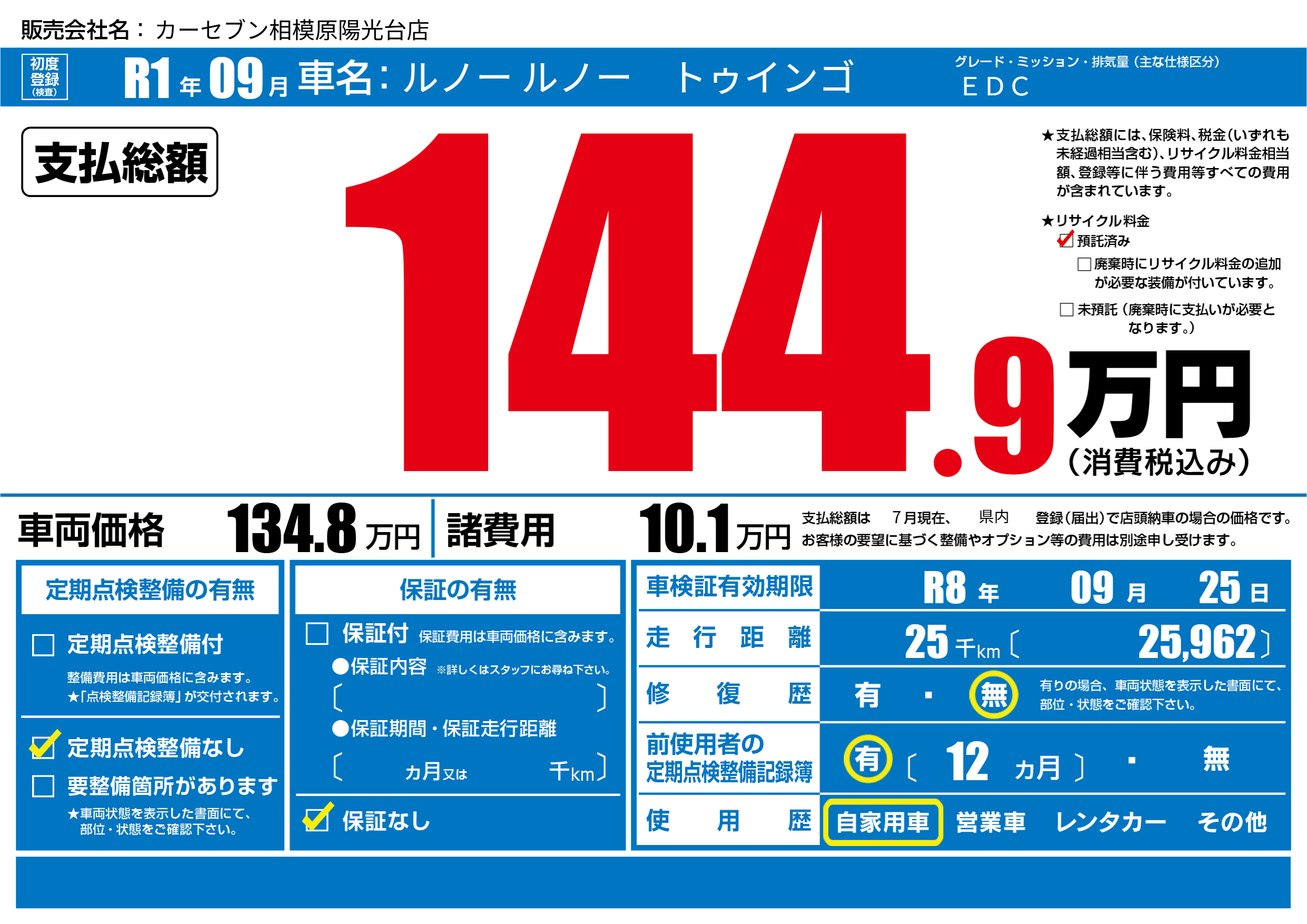 | 車名 | ルノー ルノー トゥインゴ | グレード ミッション 排気量 |