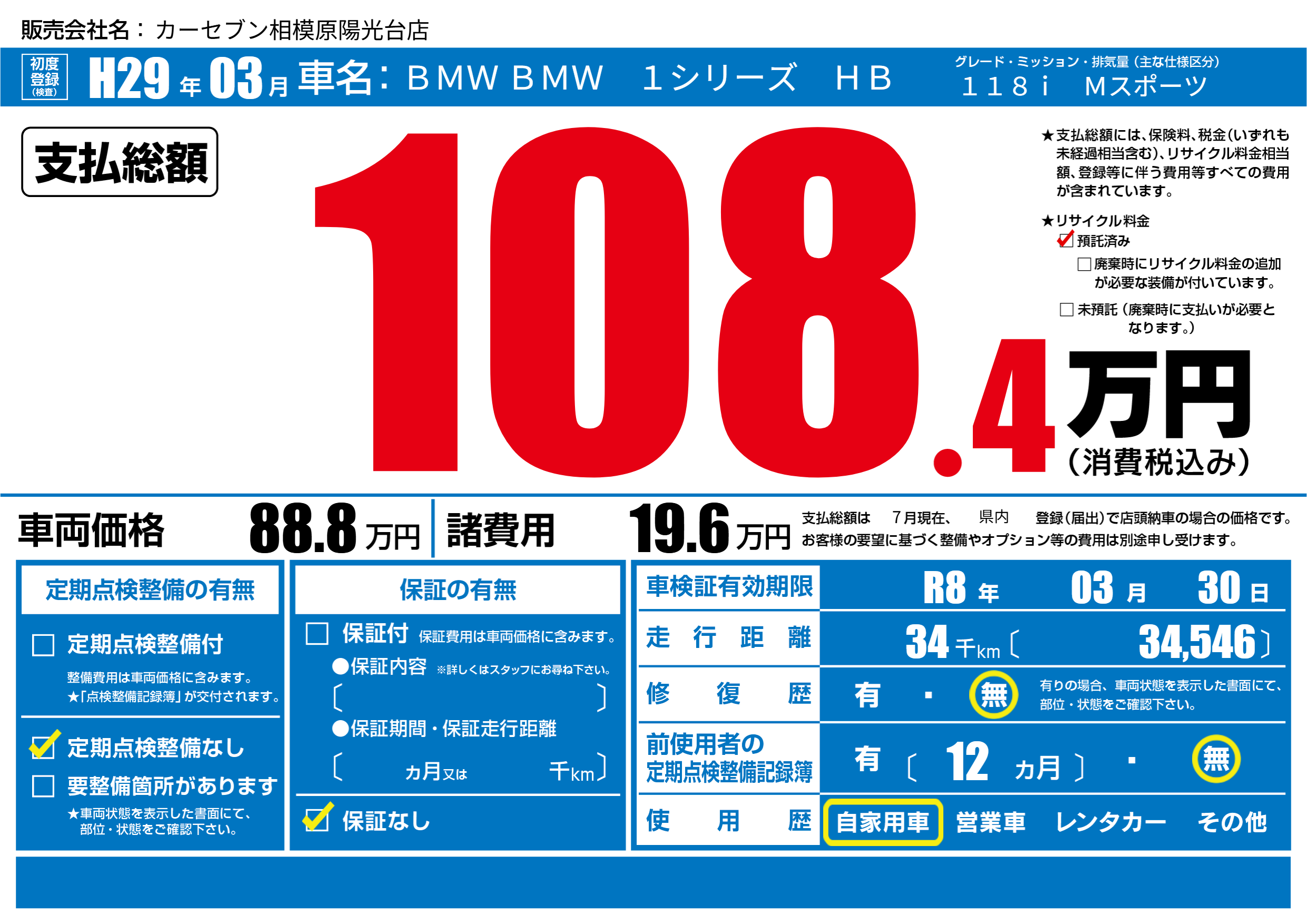 | 車名 | BMW BMW 1シリーズ HB | グレード ミッション 排気量 |