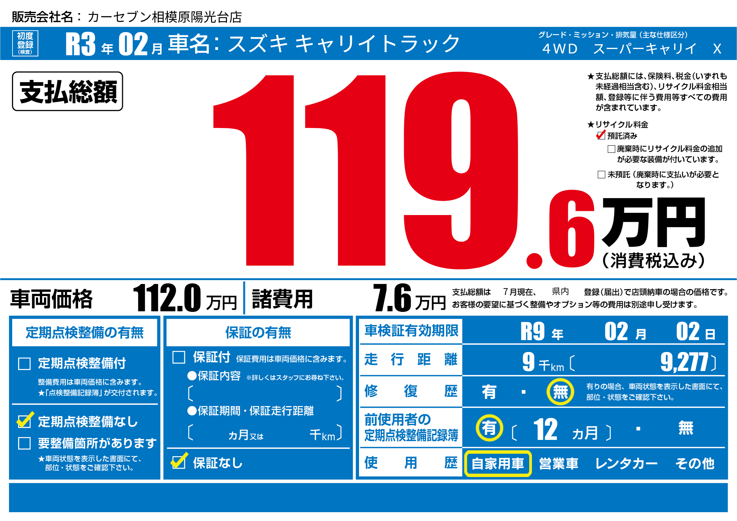 | 走行キロ | 0.9万km | 初年度登録 | R3年02月 |