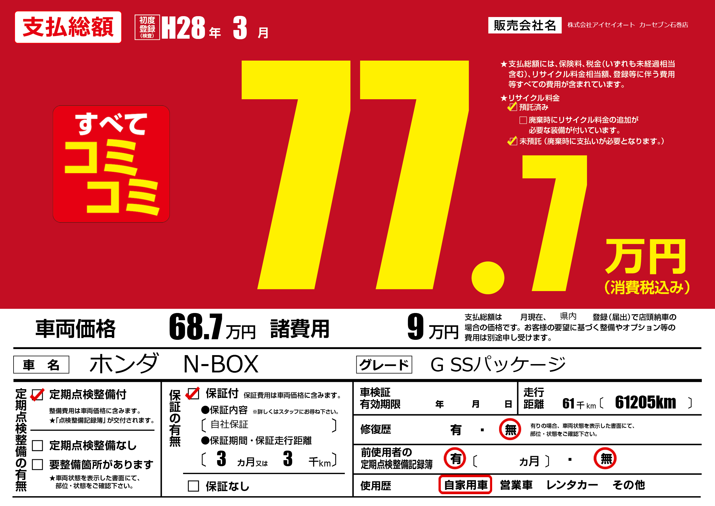 | 走行キロ | 6.1万km | 初年度登録 | H28年3月 |
