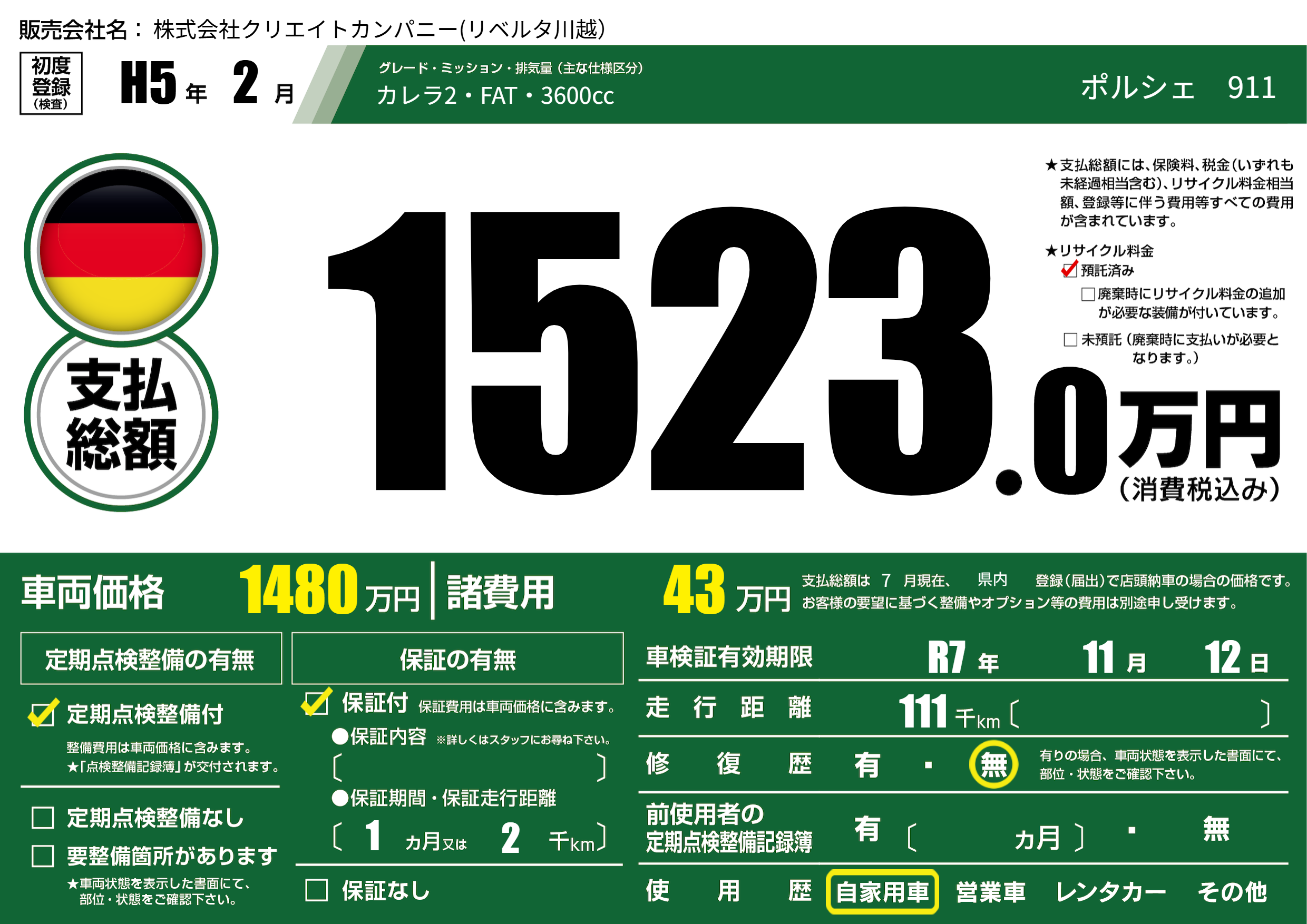 | 車名 | ポルシェ 911 | グレード ミッション 排気量 |