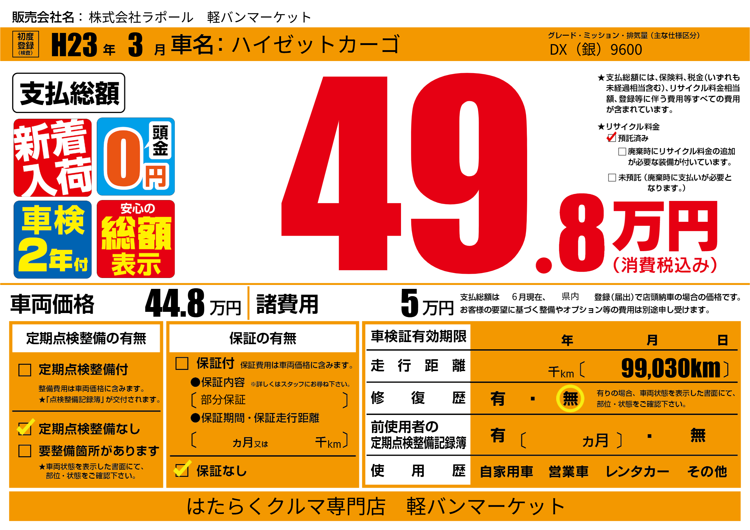 | 車名 | ハイゼットカーゴ | グレード ミッション 排気量 |