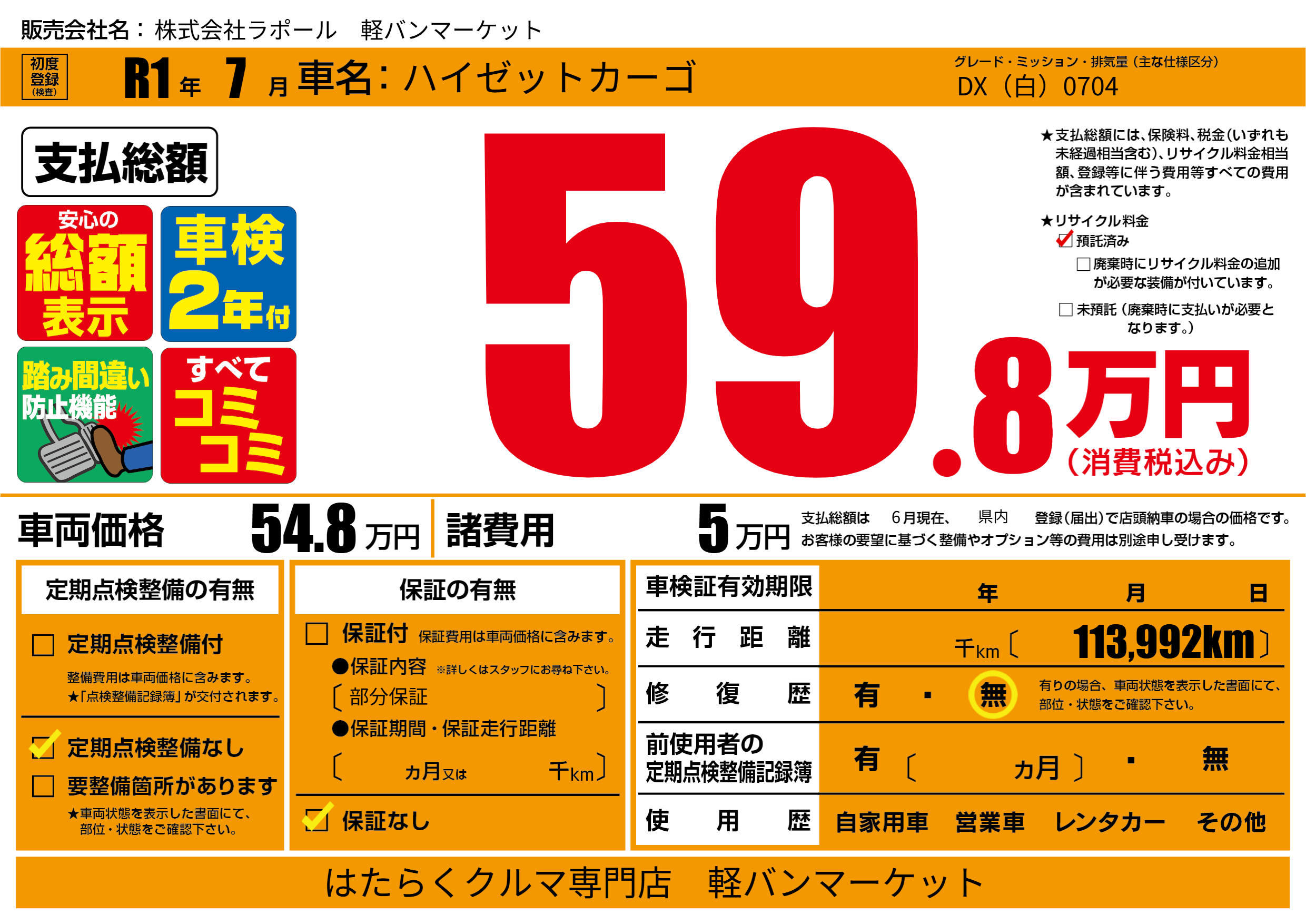 | 車名 | ハイゼットカーゴ | グレード ミッション 排気量 |