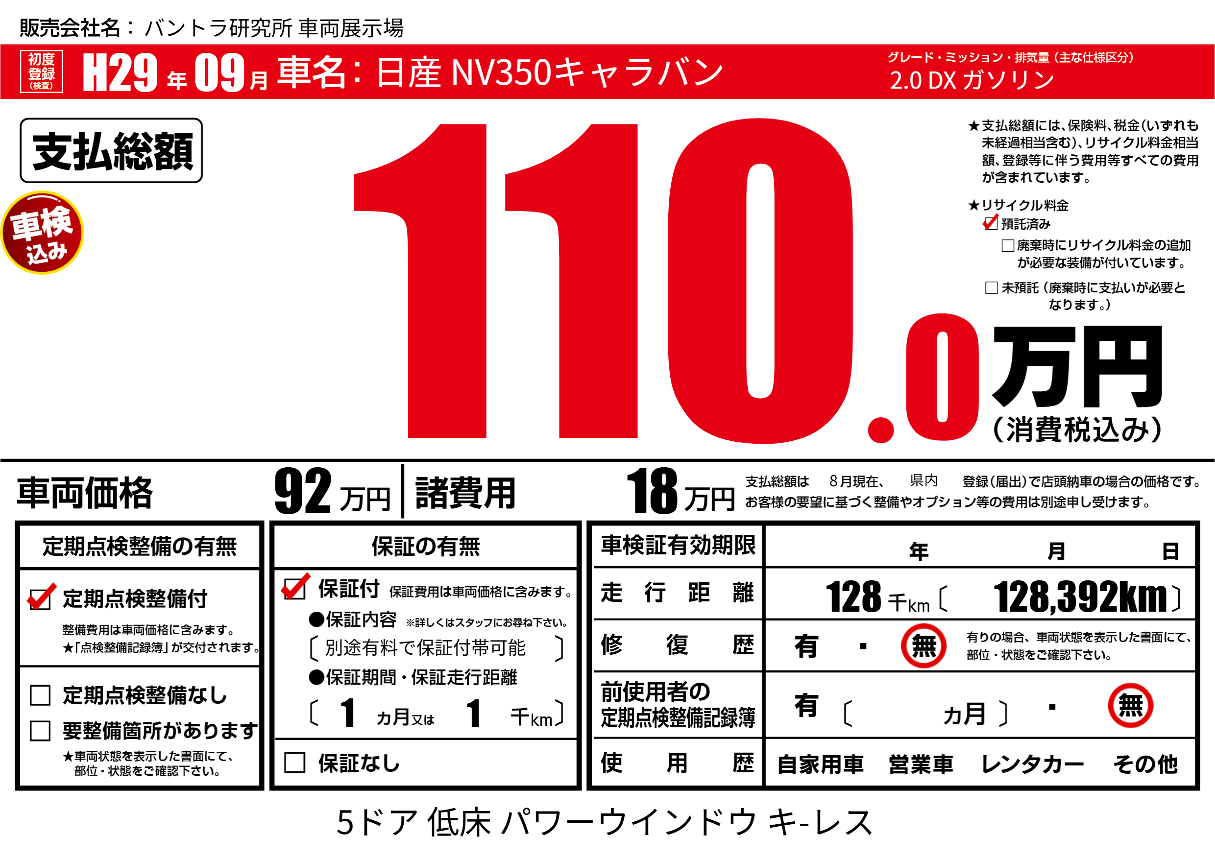 | 車名 | 日産 NV350キャラバン | グレード ミッション 排気量 |