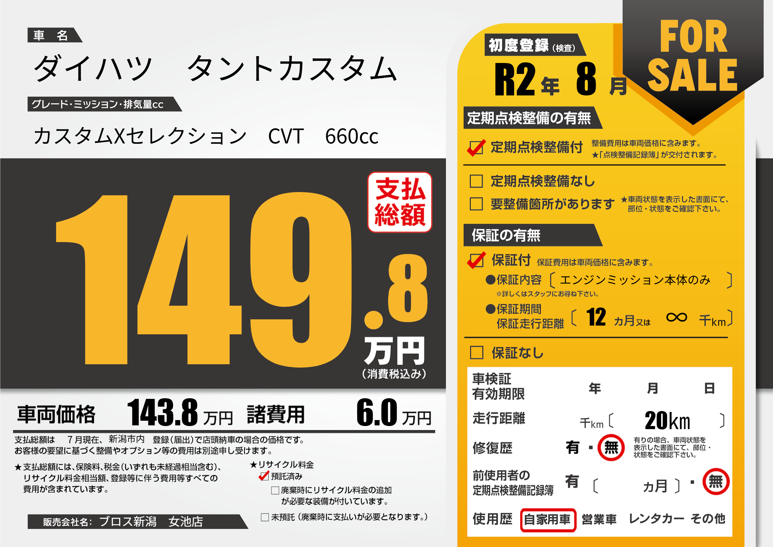 | 走行キロ | - | 初年度登録 | R2年8月 |