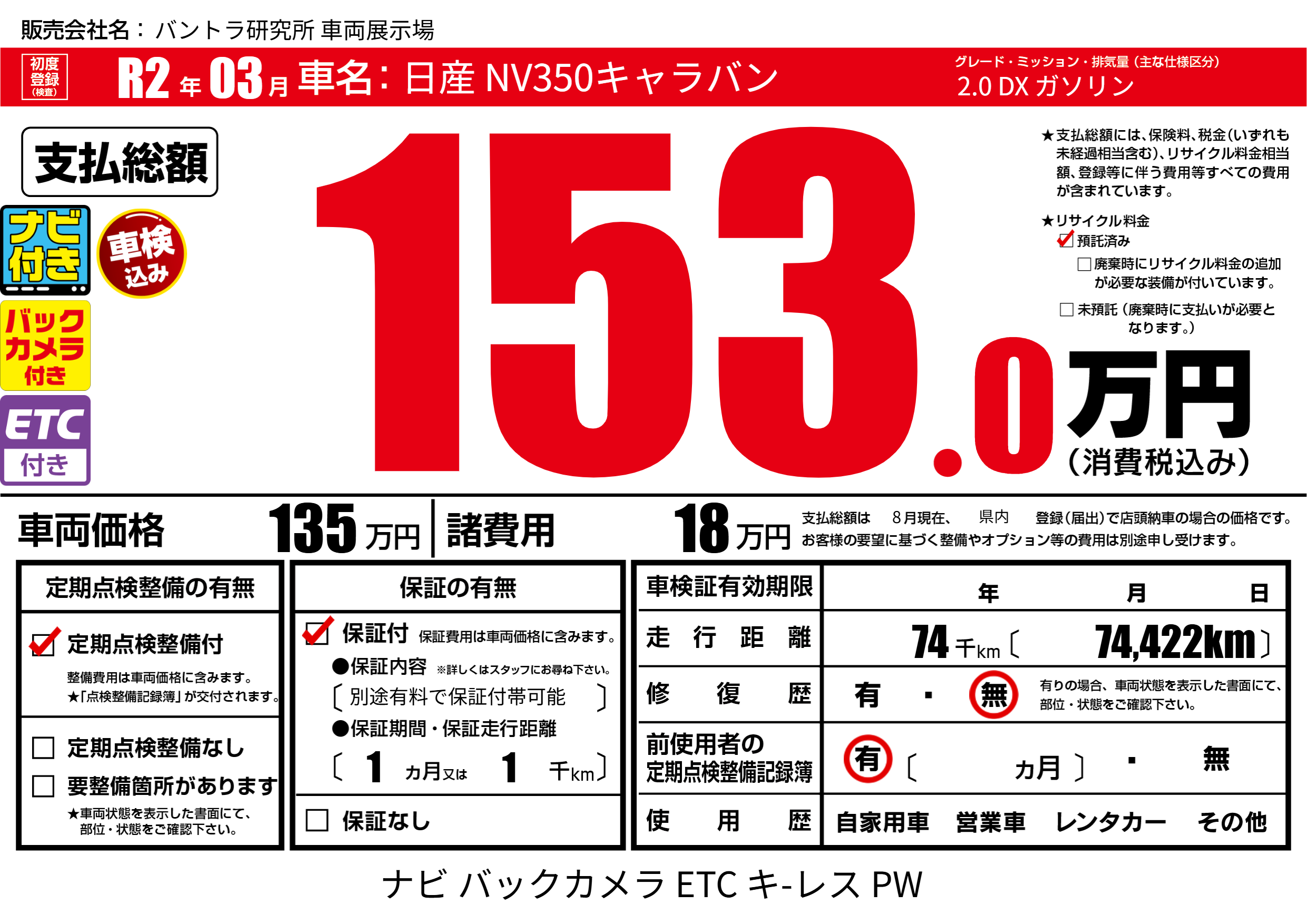 | 車名 | 日産 NV350キャラバン | グレード ミッション 排気量 |