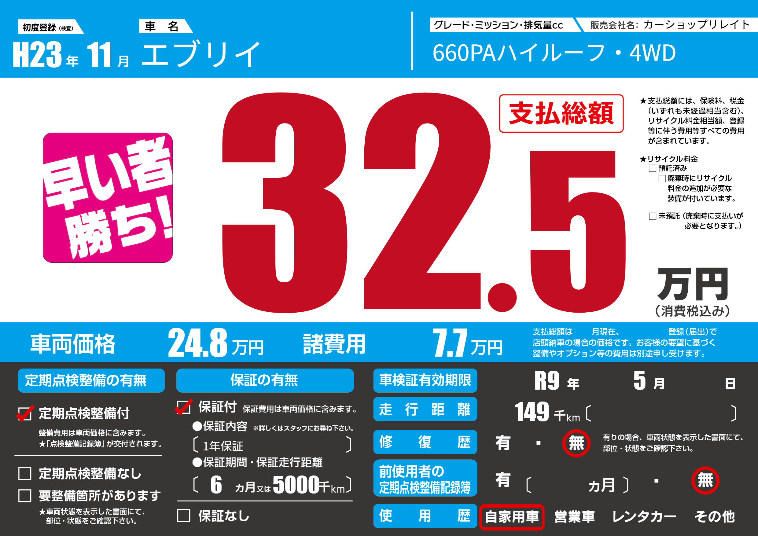 | 走行キロ | 14.9万km | 初年度登録 | H23年11月 |