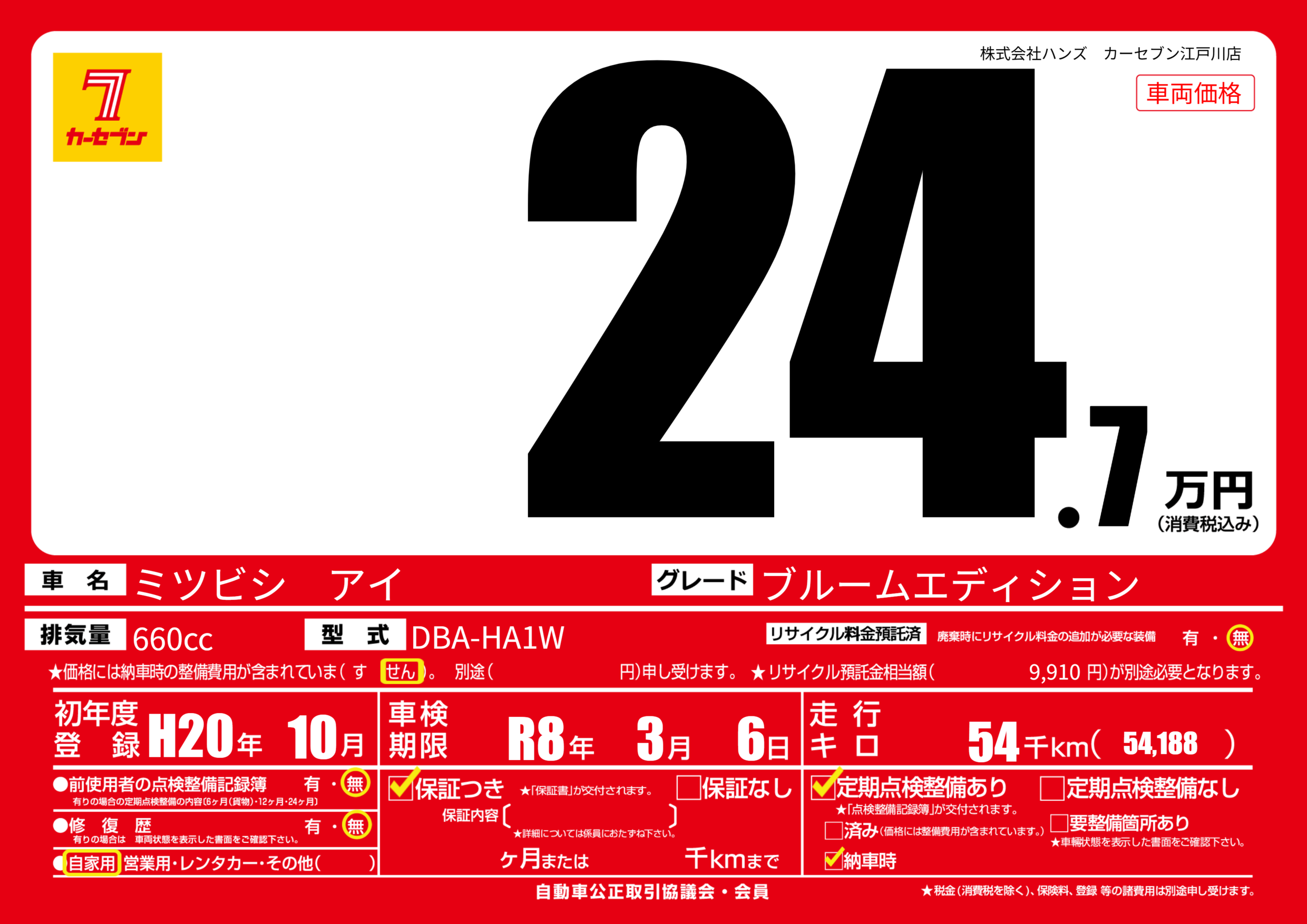 | 車名 | ミツビシ アイ | グレード ミッション 排気量 |