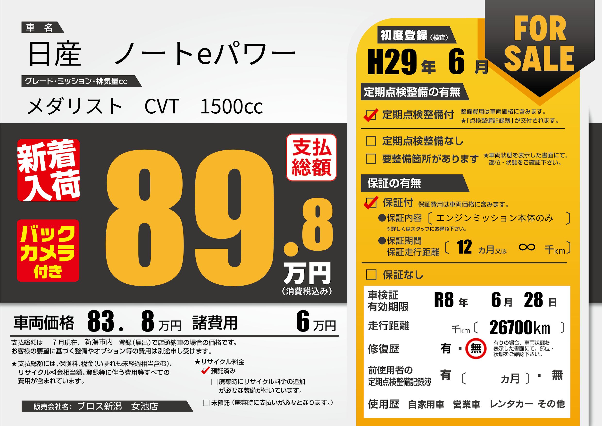 | 車名 | 日産 ノートeパワー | グレード ミッション 排気量 |