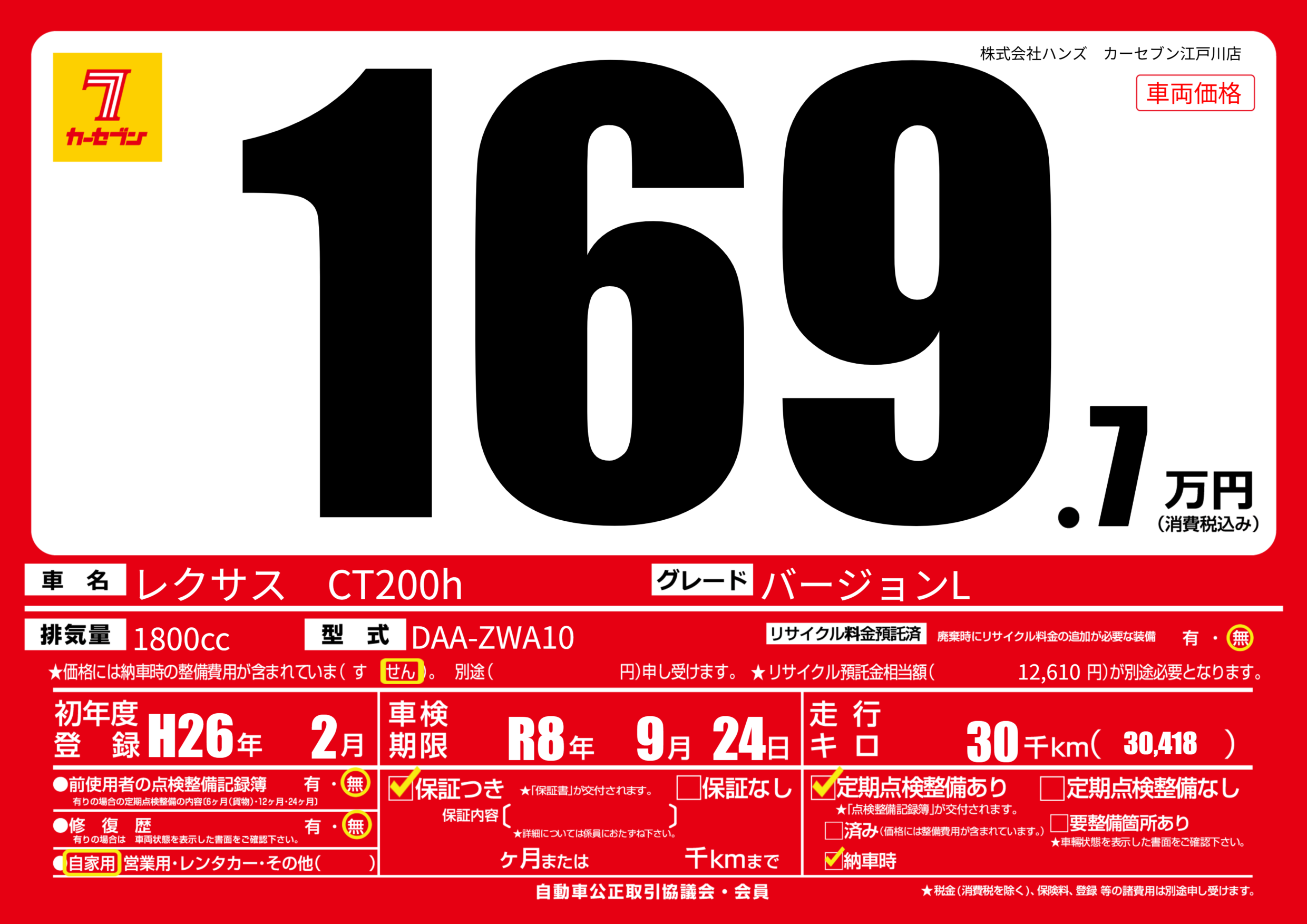 | 車名 | レクサス CT200h | グレード ミッション 排気量 |