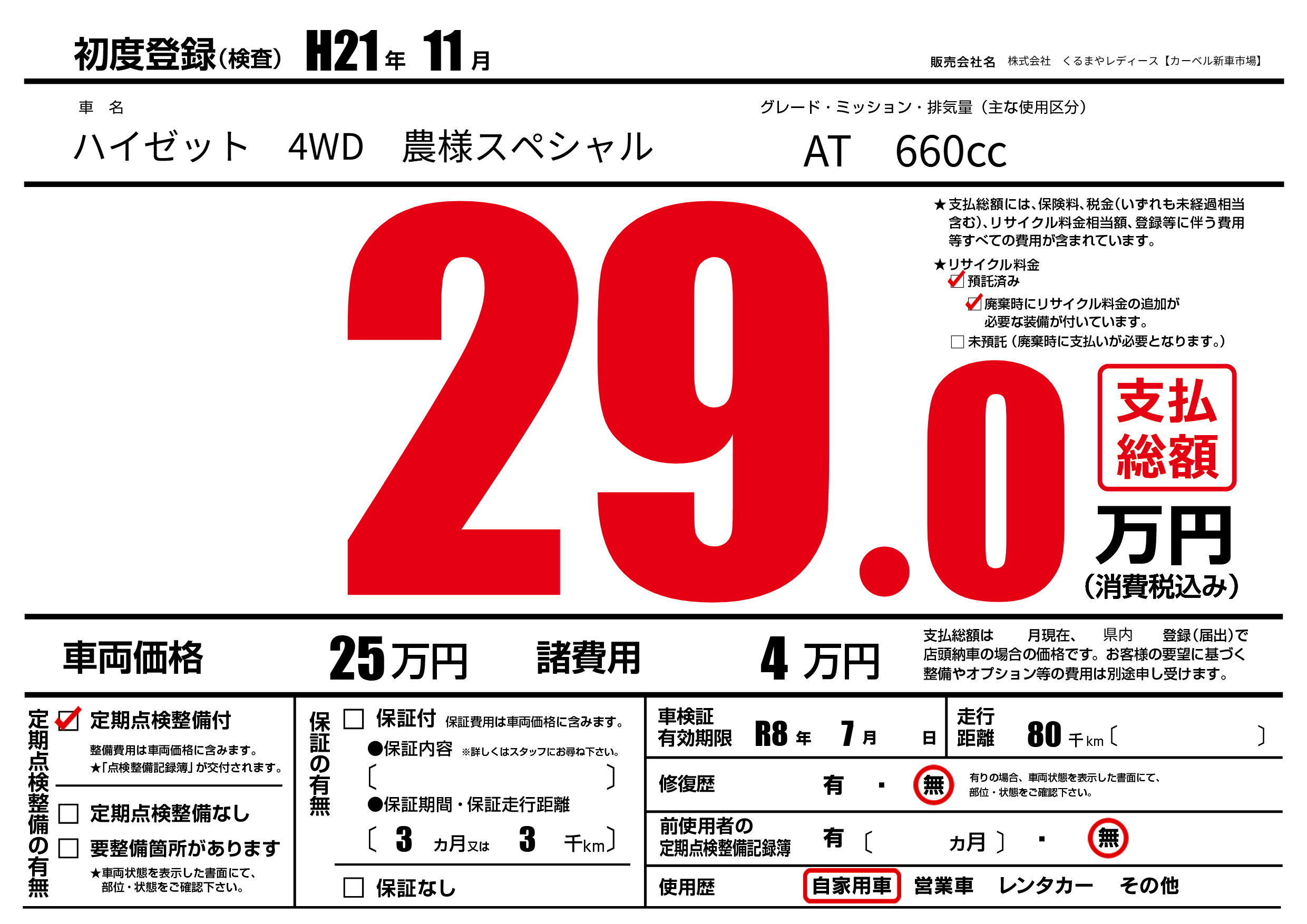 | 走行キロ | 8万km | 初年度登録 | H21年11月 |