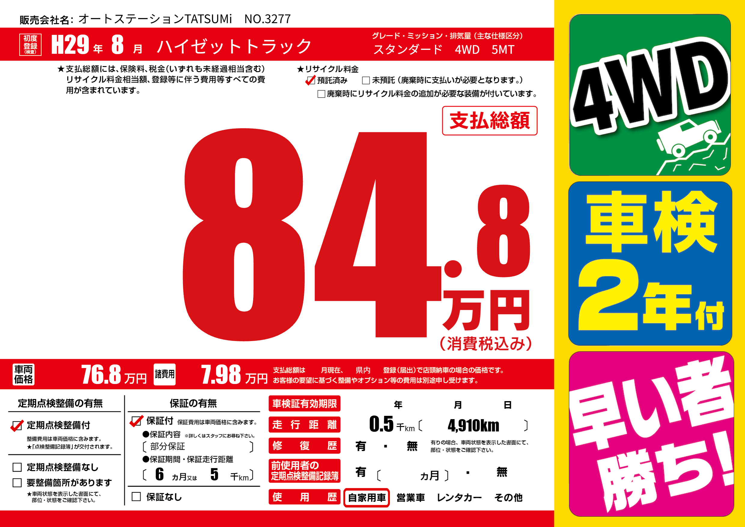 保証付き 保証内容(部分保証) 6ヶ月または(5)千kmまで |