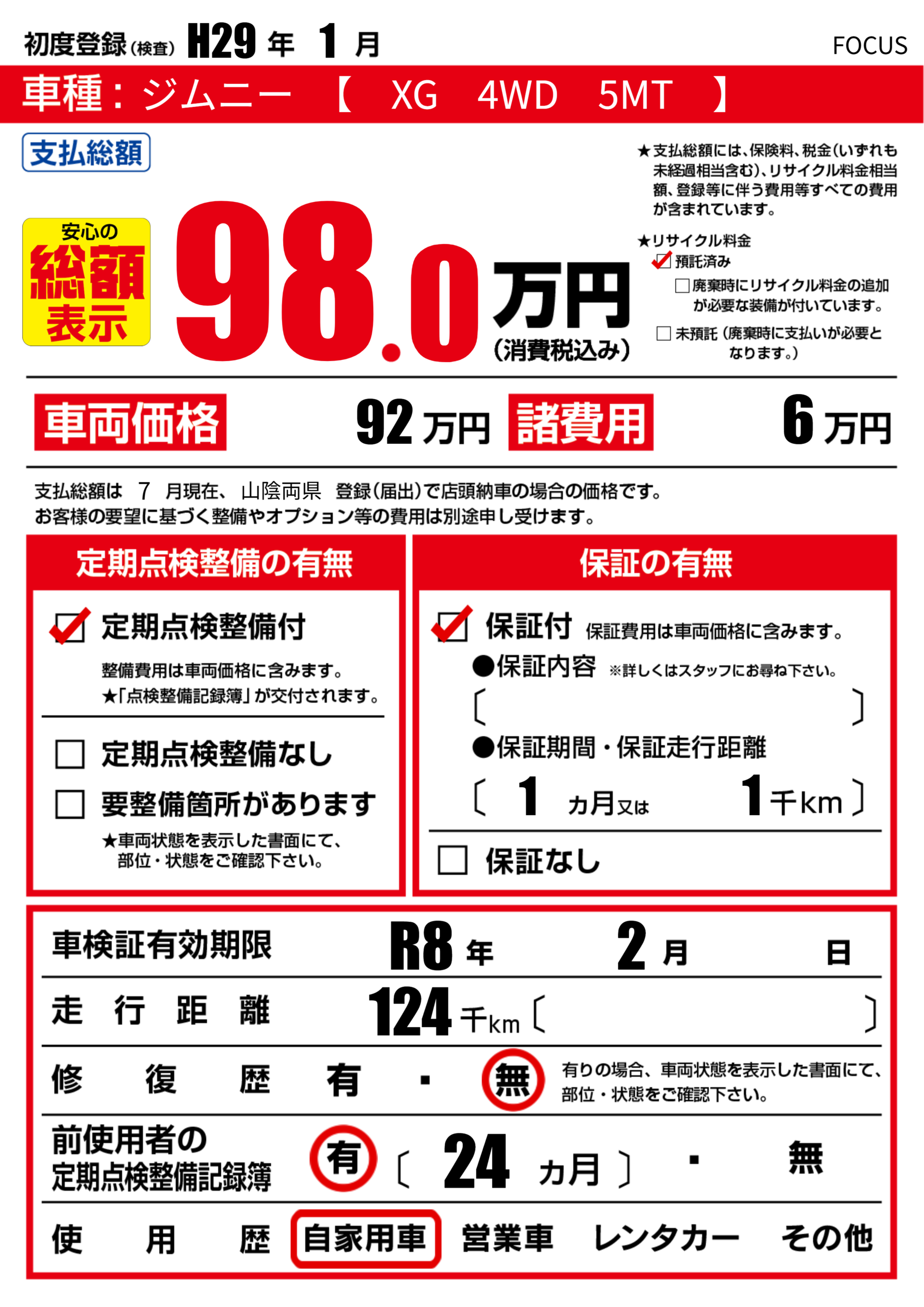 | 車検制限 | R8年 2月 - 日 | ||