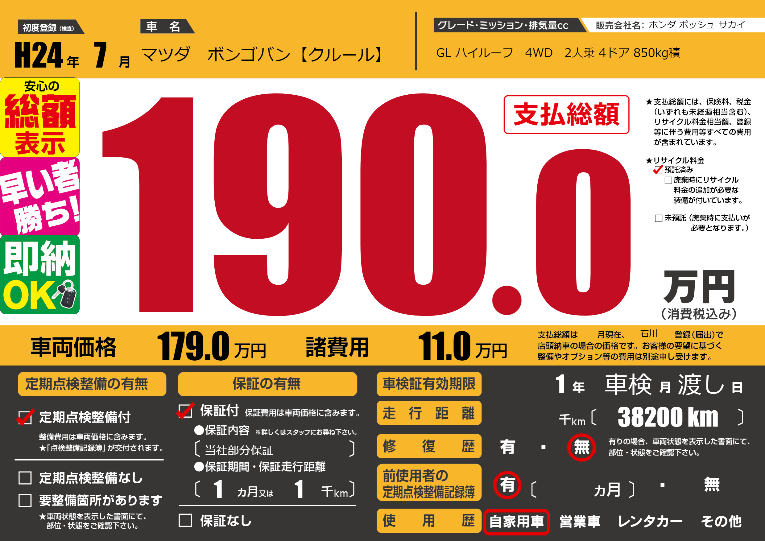 | 車名 | マツダ ボンゴバン【クルール】 | グレード ミッション 排気量 |