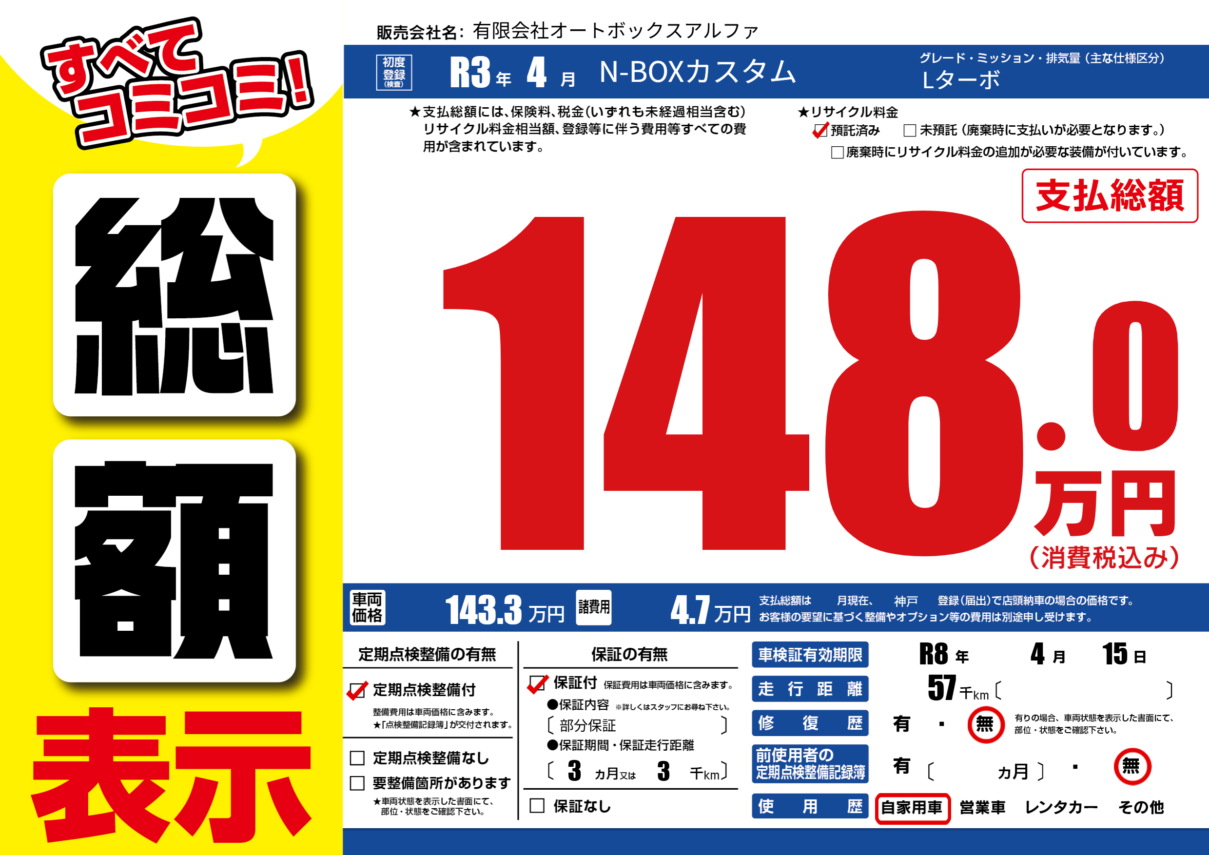 | 車名 | N-BOXカスタム | グレード ミッション 排気量 |