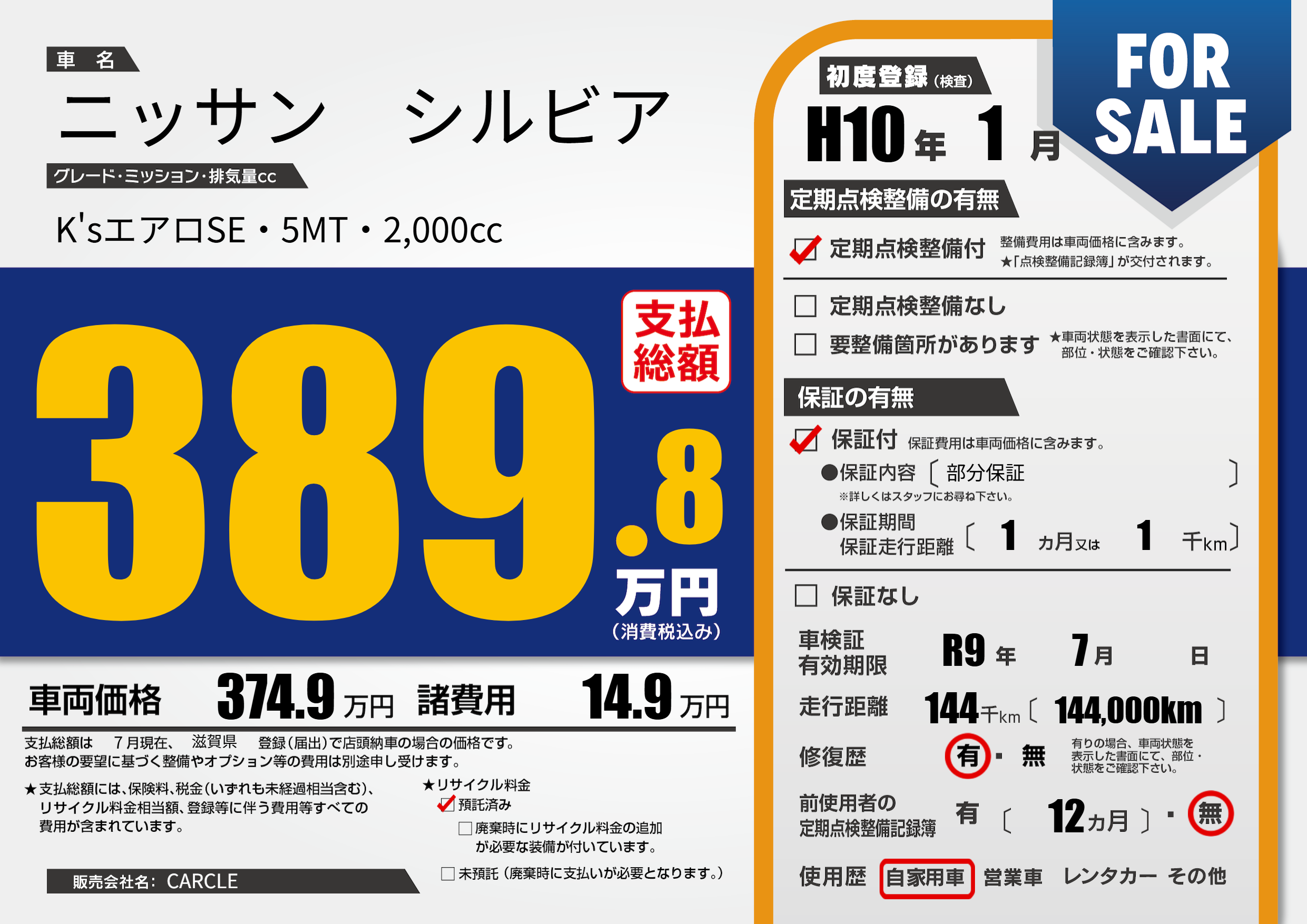 | 車検制限 | R9年 7月 - 日 | ||