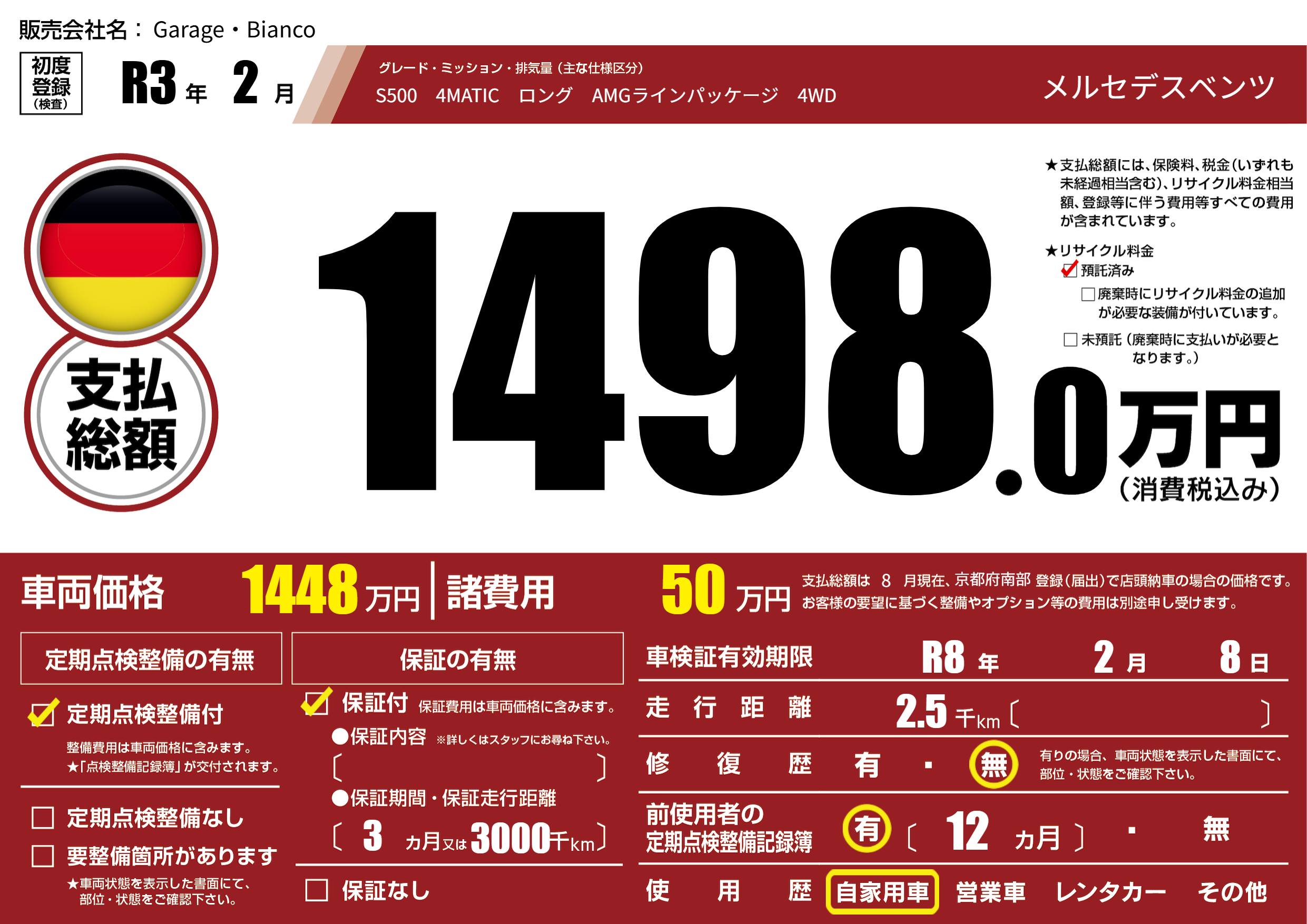 保証付き 保証内容(---) 3ヶ月または(3000)千kmまで |