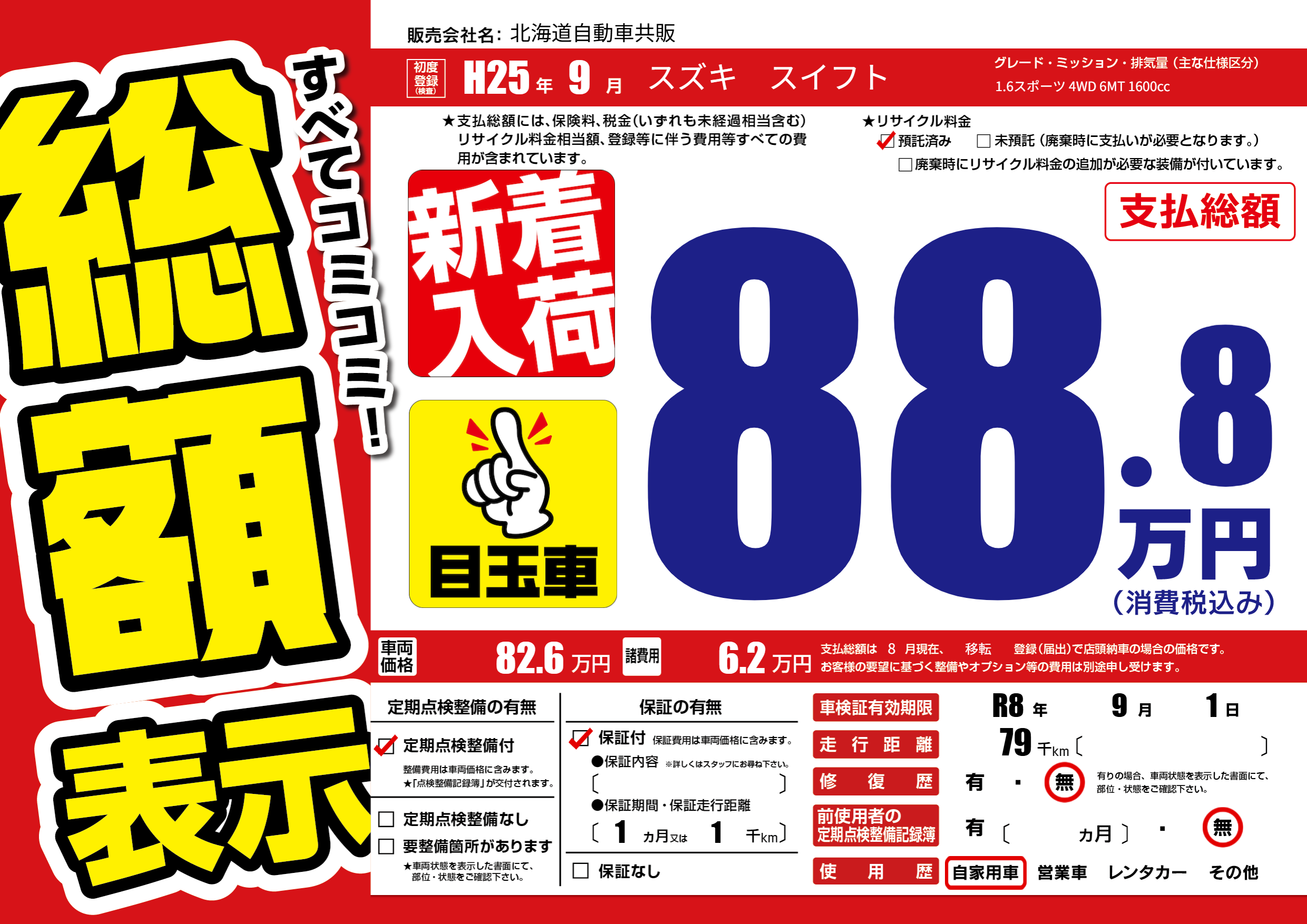 | 車名 | スズキ スイフト | グレード ミッション 排気量 |