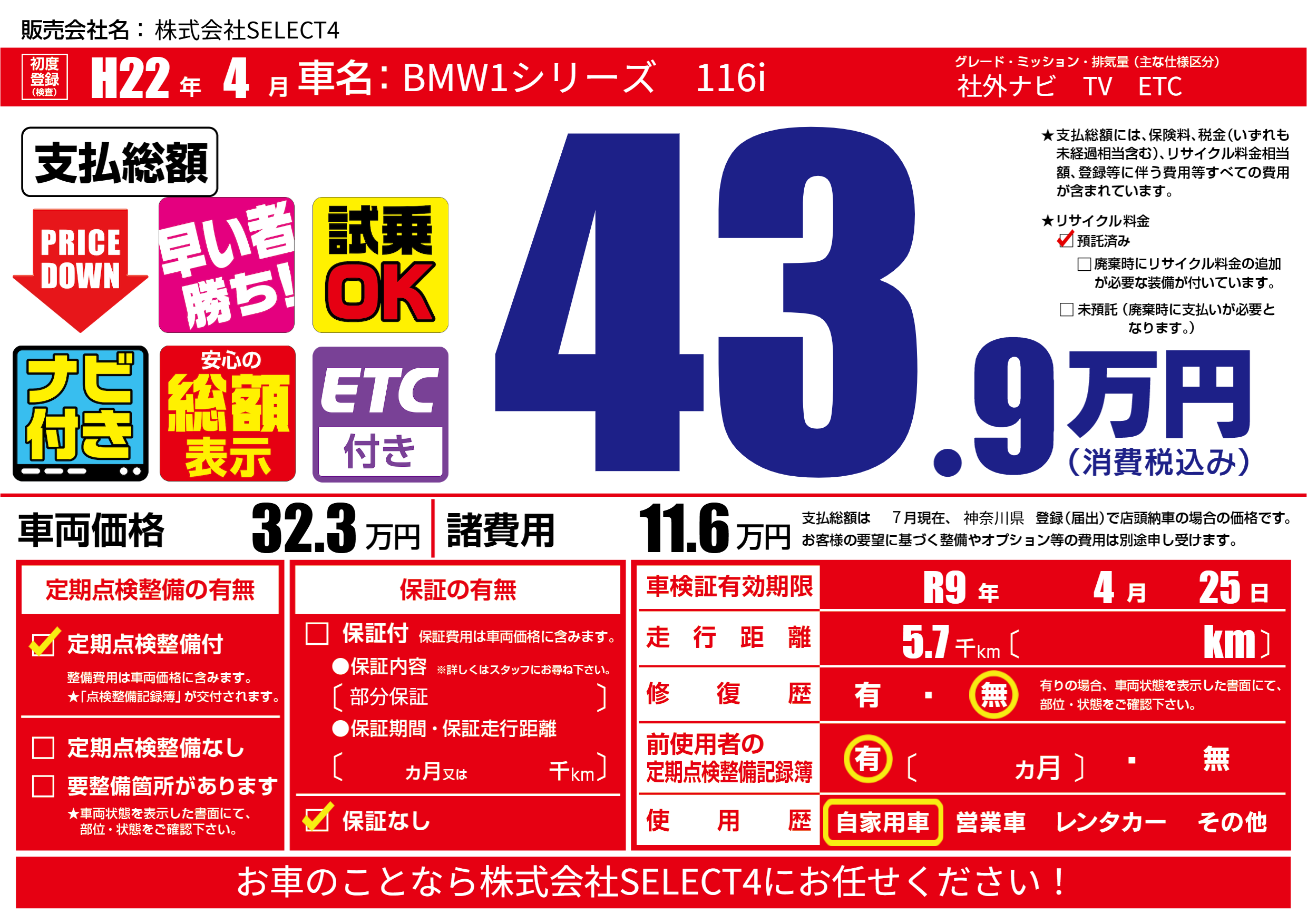| 車名 | BMW1シリーズ 116i | グレード ミッション 排気量 |