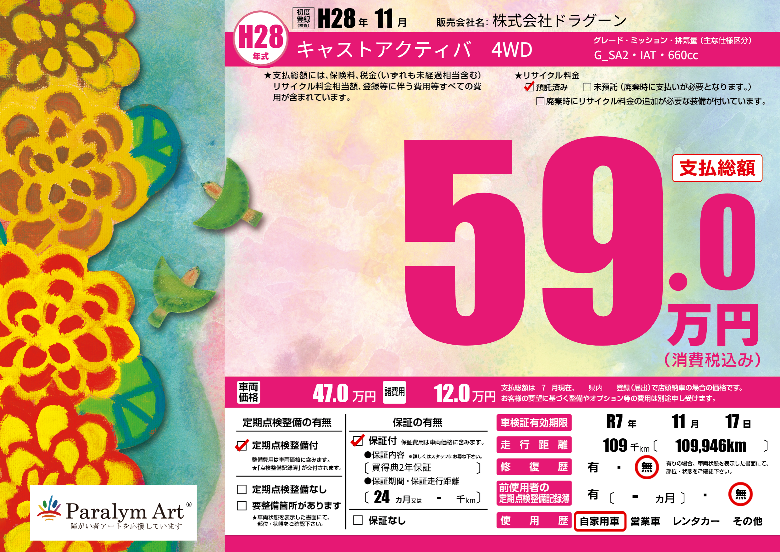 | 車名 | キャストアクティバ 4WD | グレード ミッション 排気量 |