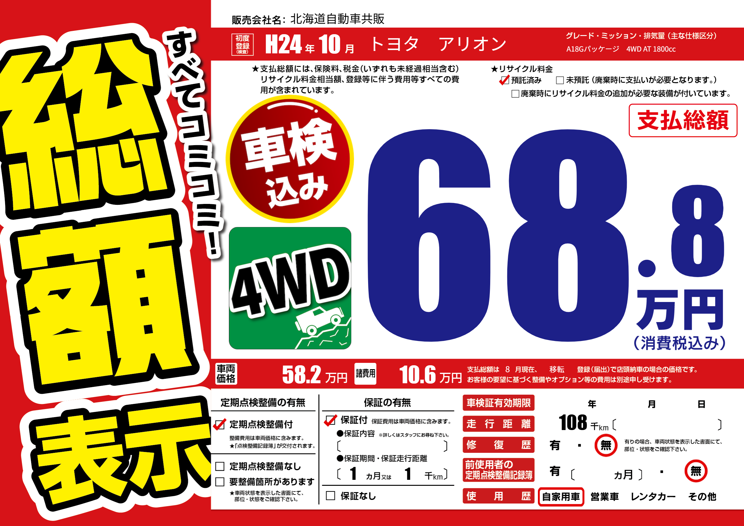 | 走行キロ | 10.8万km | 初年度登録 | H24年10月 |