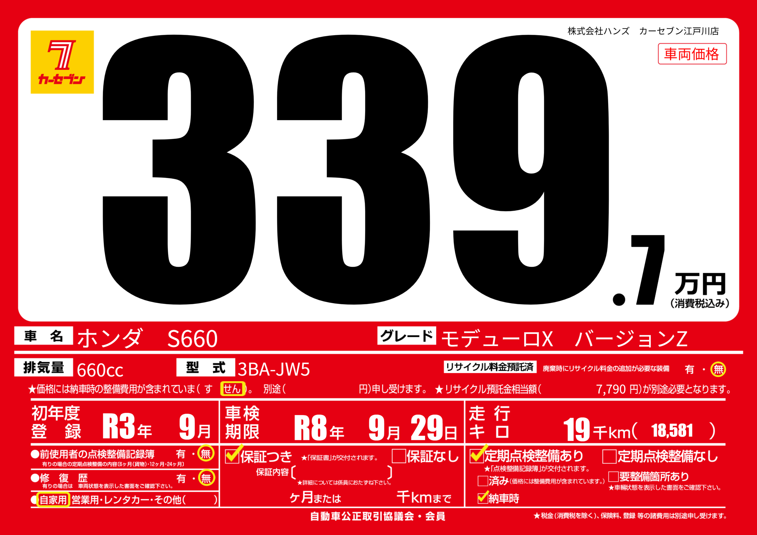 | 車名 | ホンダ S660 | グレード ミッション 排気量 |